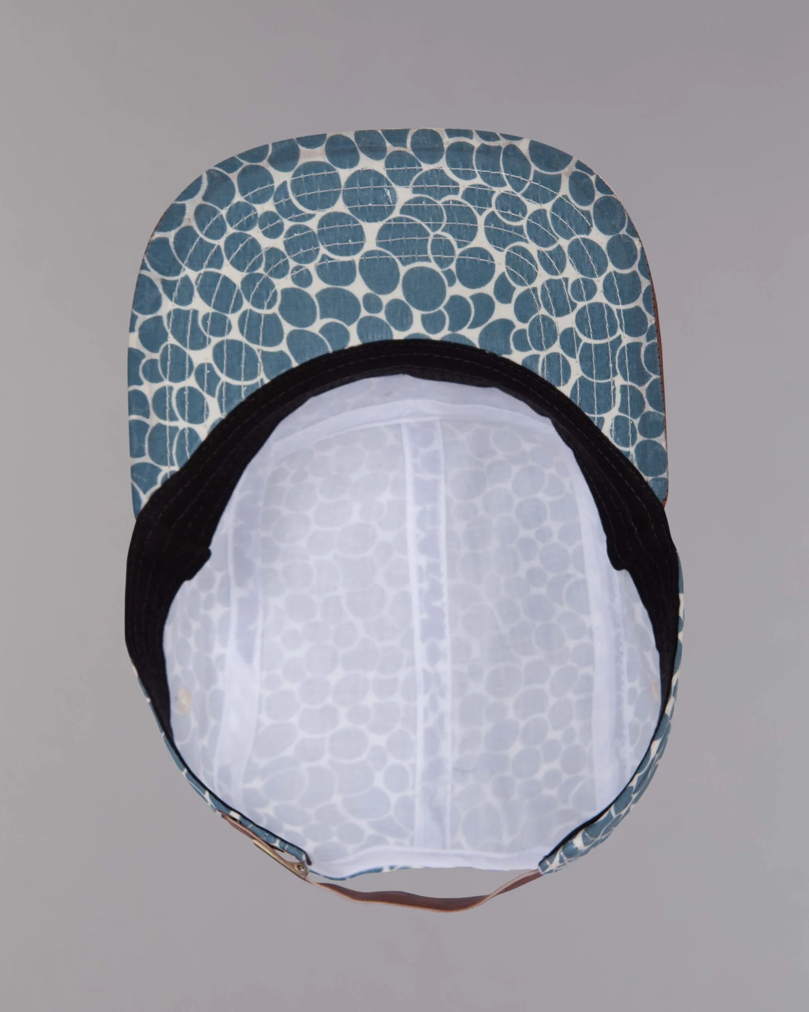 Gorra modelo ciclista frente partido, sublimación digital, visera plana y superior en sintetico, dos ojaletes laterales y regulador trasero hebilla metálica con correa en sintetico y ojalete ovalado metalico