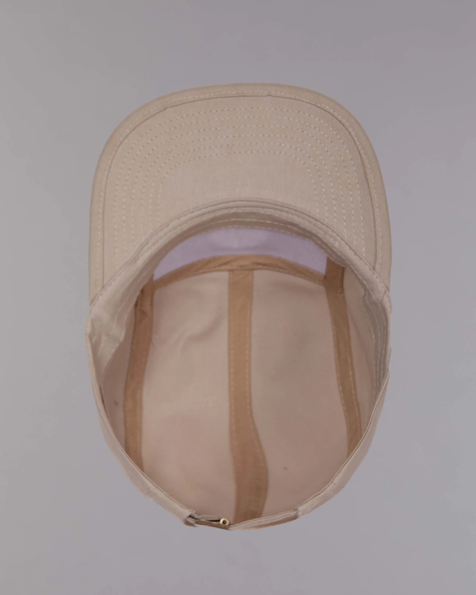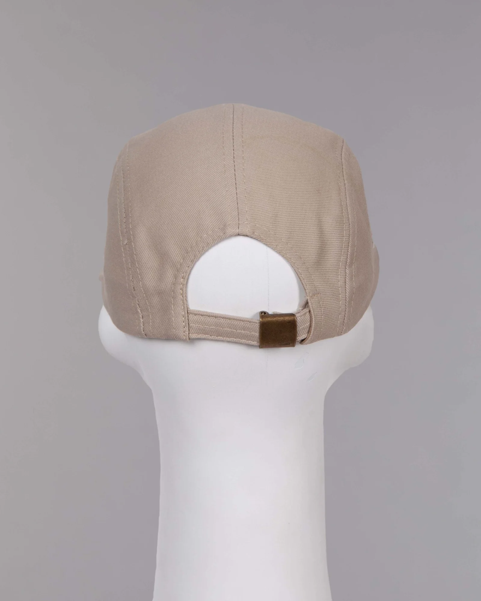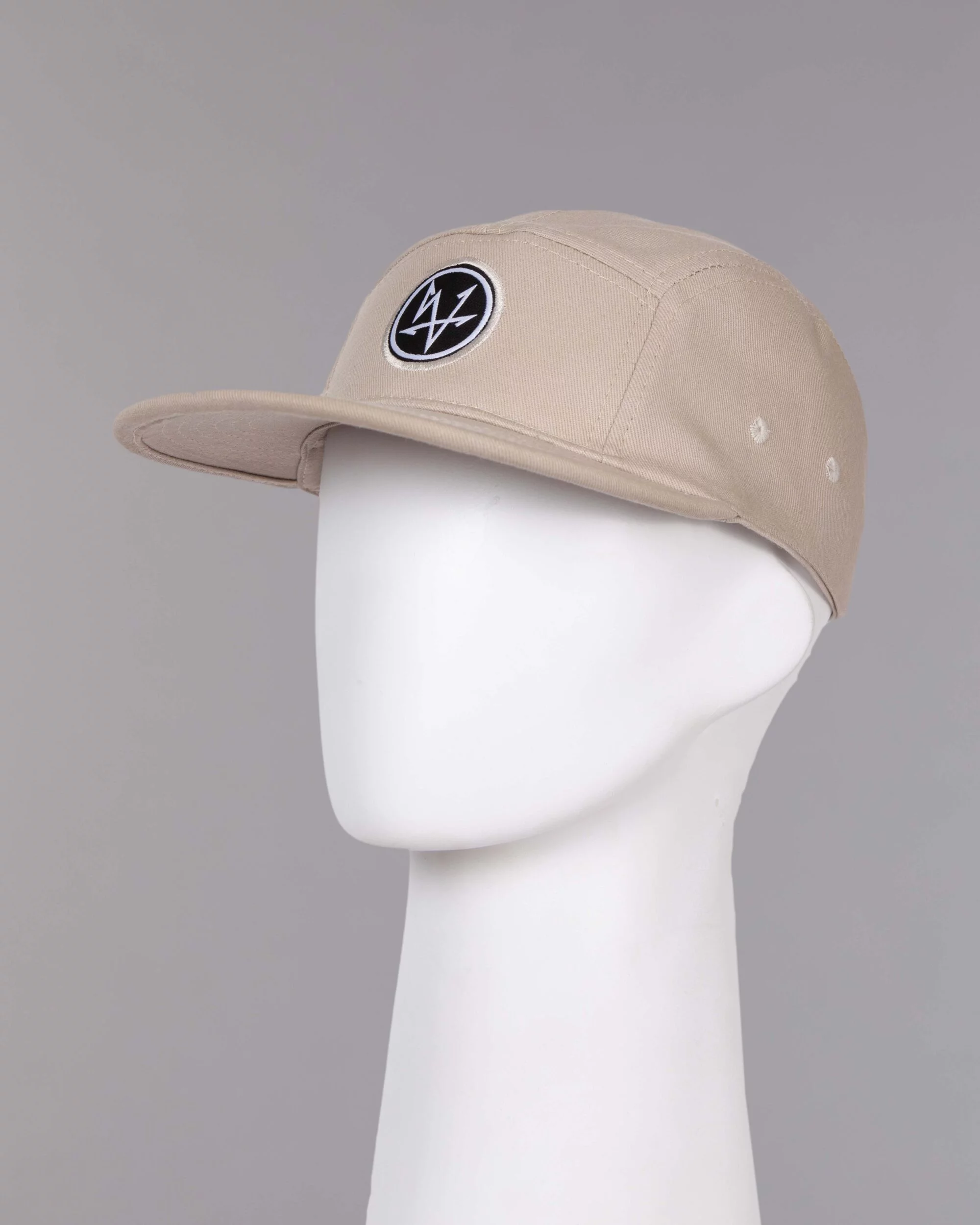 Gorra en dirl beige, modelo five panel visera plana con seis costuras, frente con refuerzo duro, ribete en la visera, dos ojaletes al tono en cada lateral, regulador trasero hebilla metálica, bordado aplique tejido.