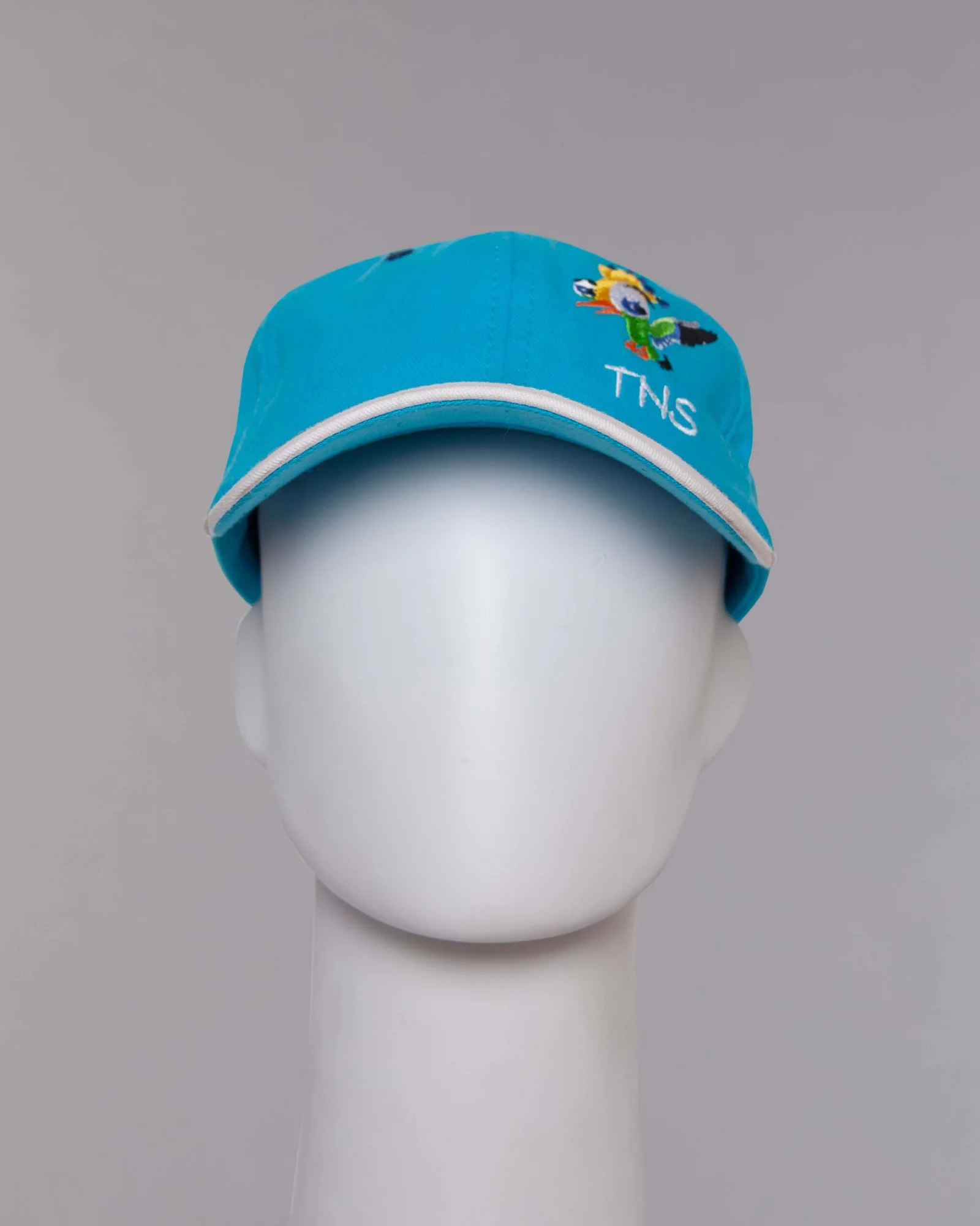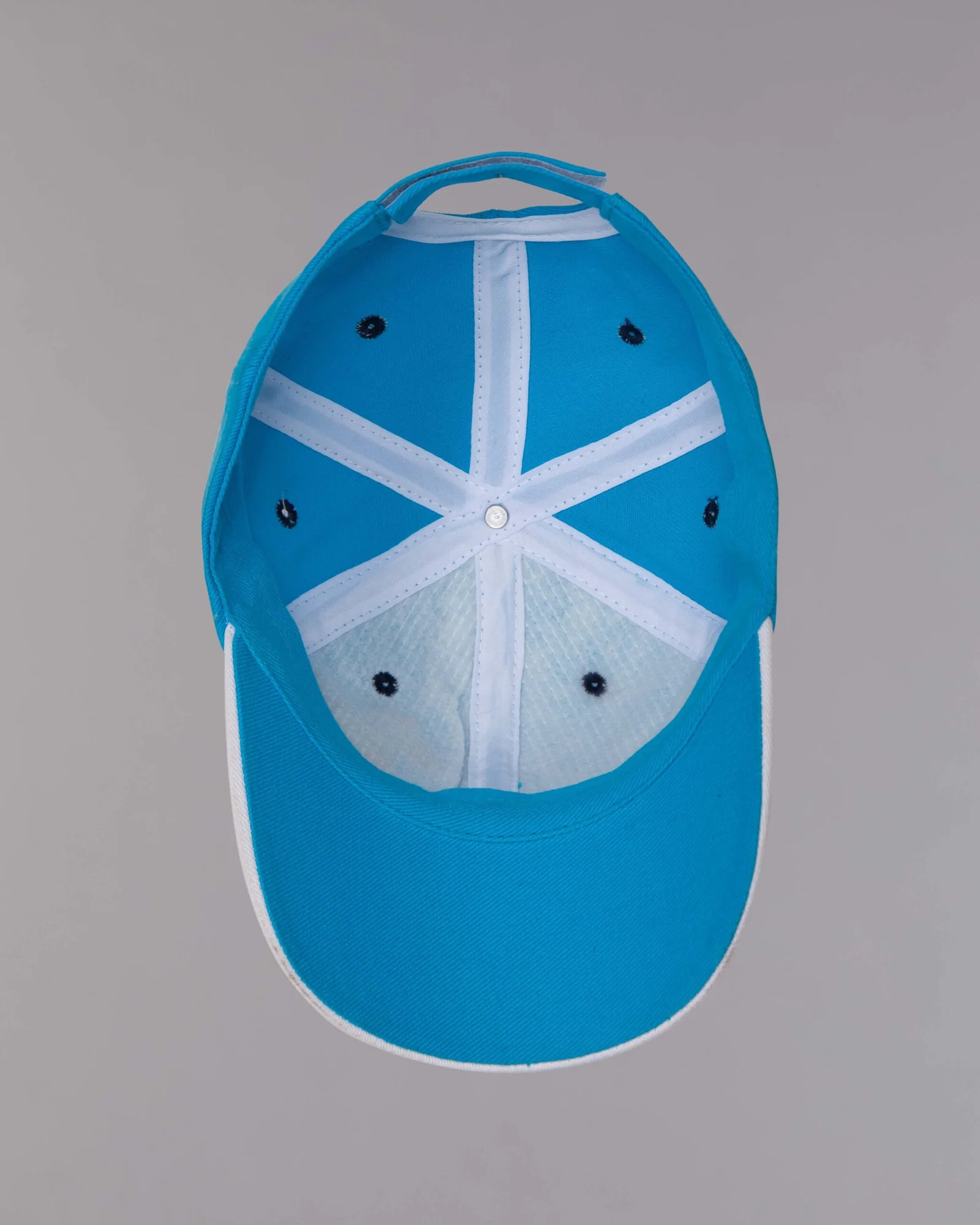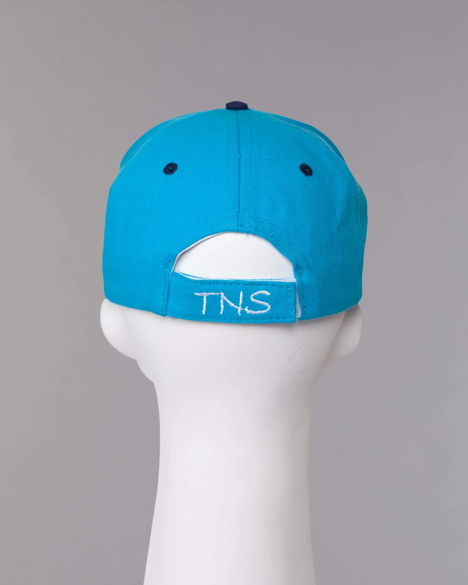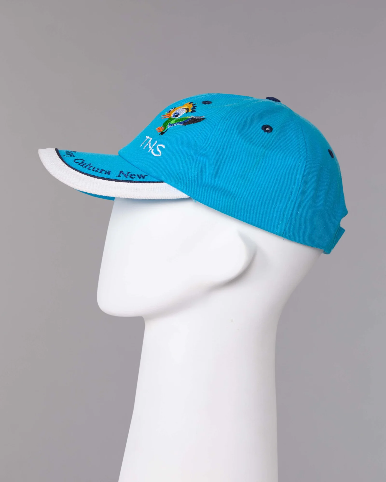 Gorra en dril algodon turquesa, seis ojaletes bordados en contraste, visera curva con metido medialuna en contraste y vivo en contraste, regulador con velcro adhesivo, bordado en el frente lado izquierdo, bordado en la visera y en el velcro