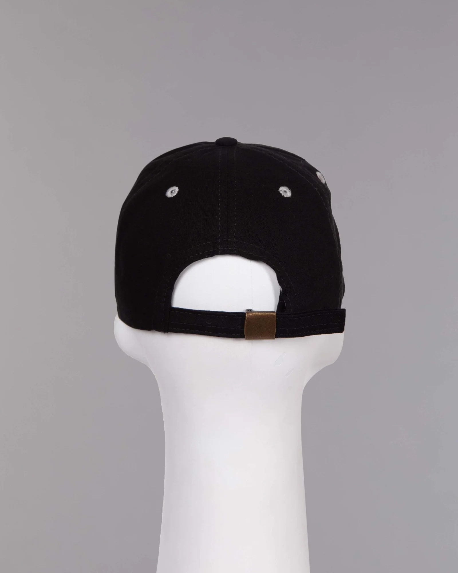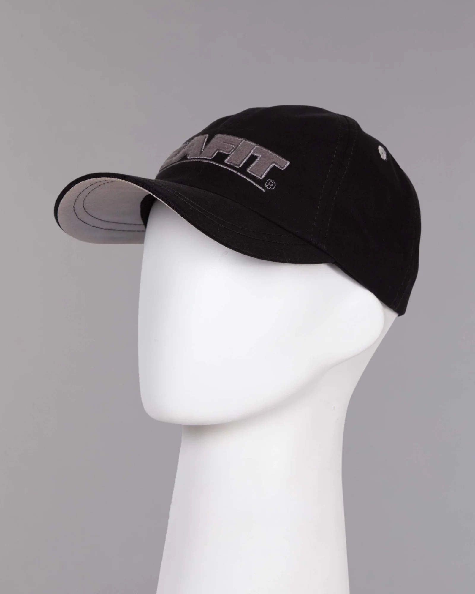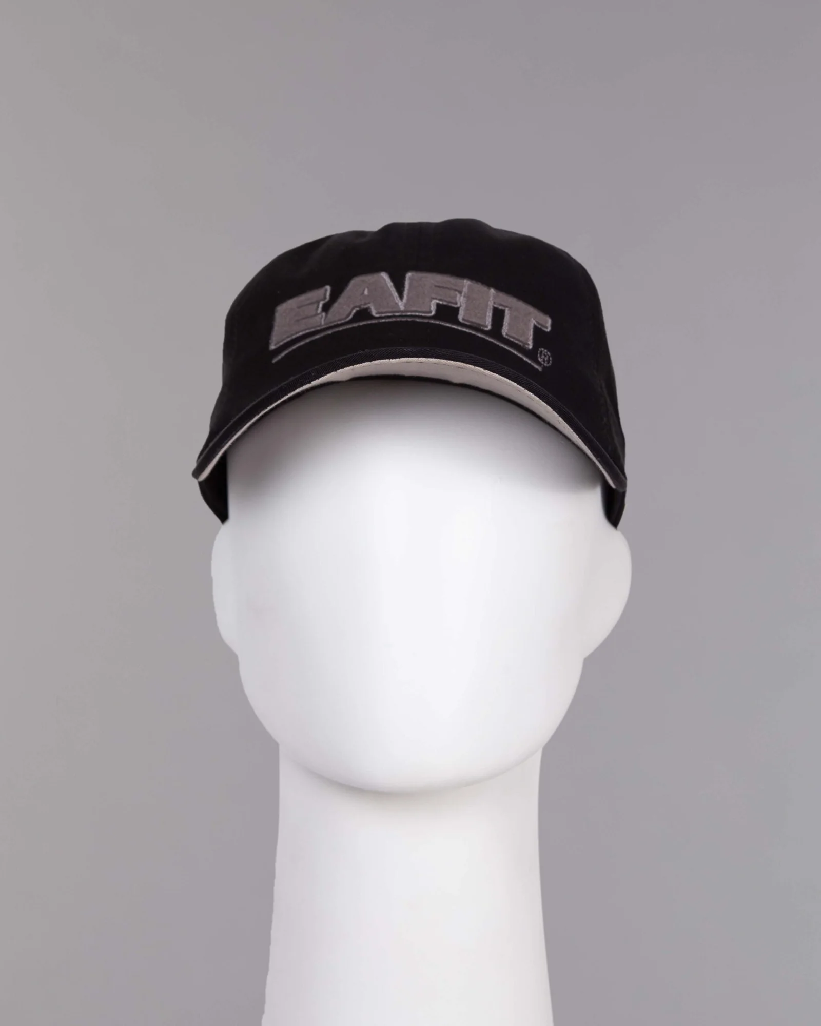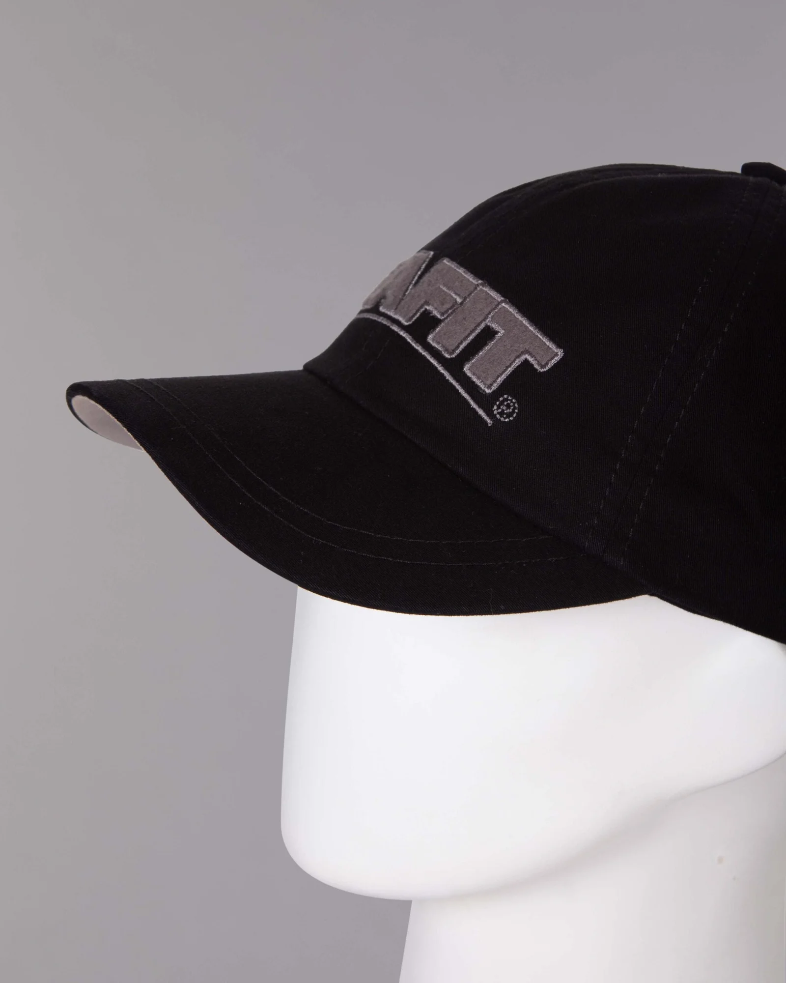 Gorra en dril negro, seis cascos frente suave, cuatro ojaletes bordados en contraste, visera inferior en contraste, regulador hebilla metálica, bordado con aplique «Fleece»