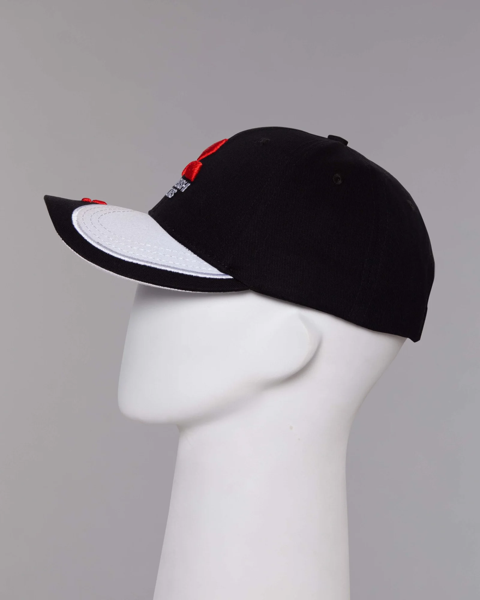 Gorra en dril algodón, seis cascos frente duro, seis ojáleles bordados al tono, visera curva con diseño especial, doble color y bordado especial, regulador velcro adhesivo, bordado en el frente en alto relieve