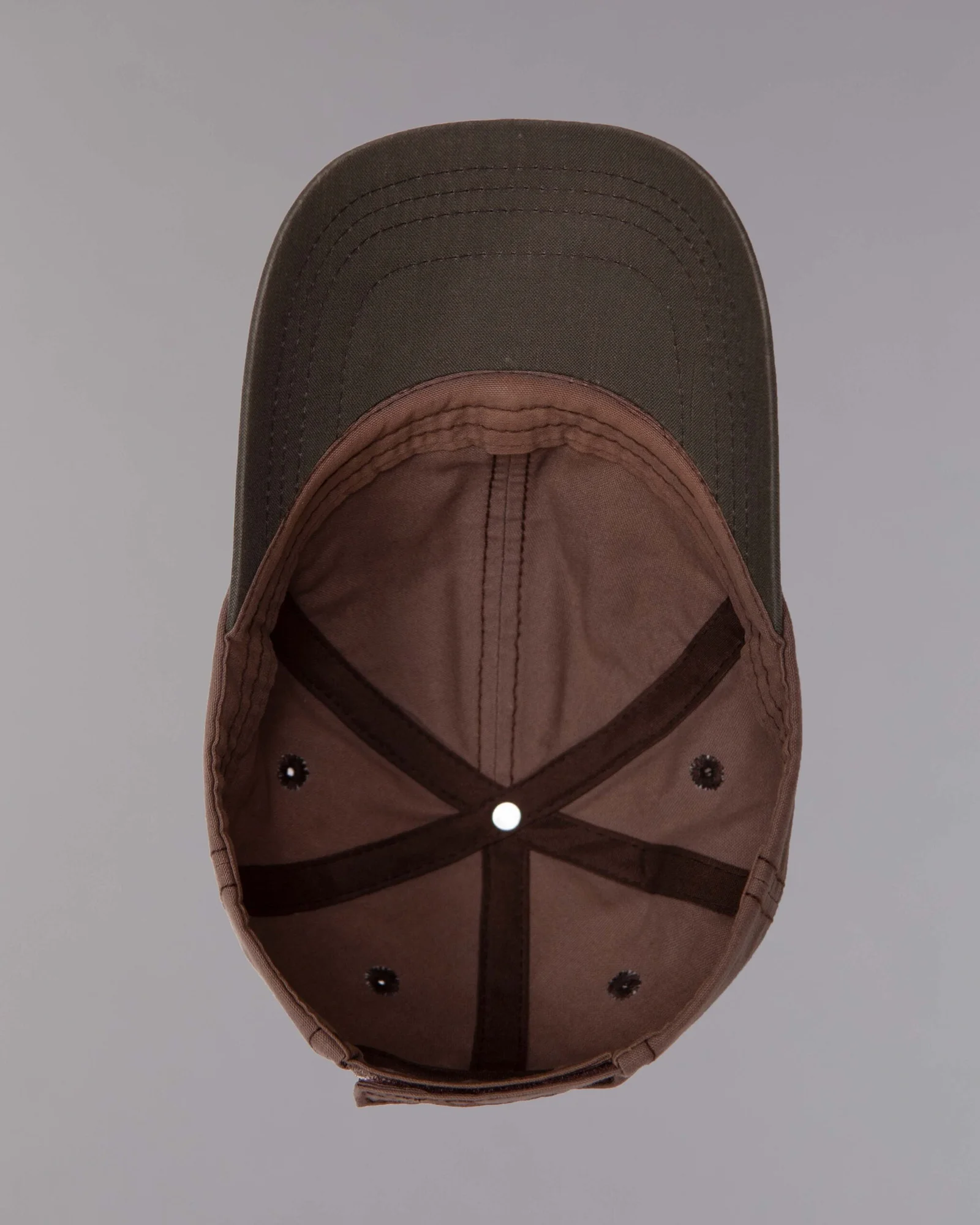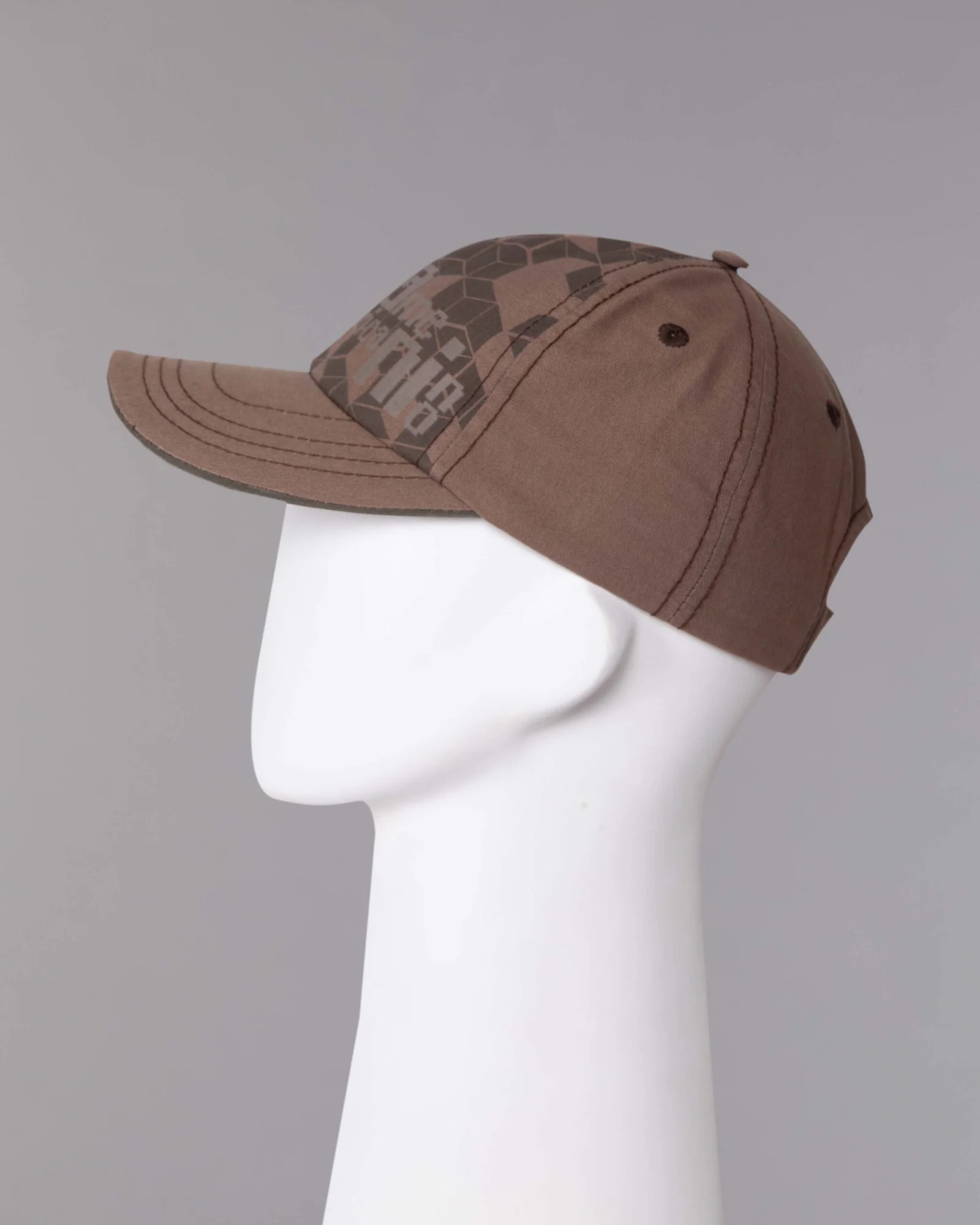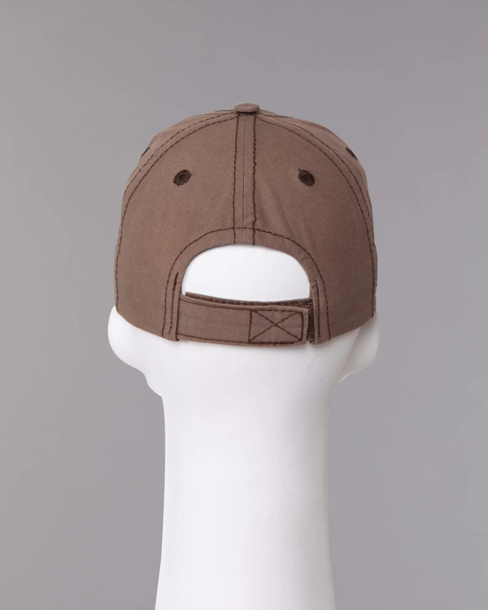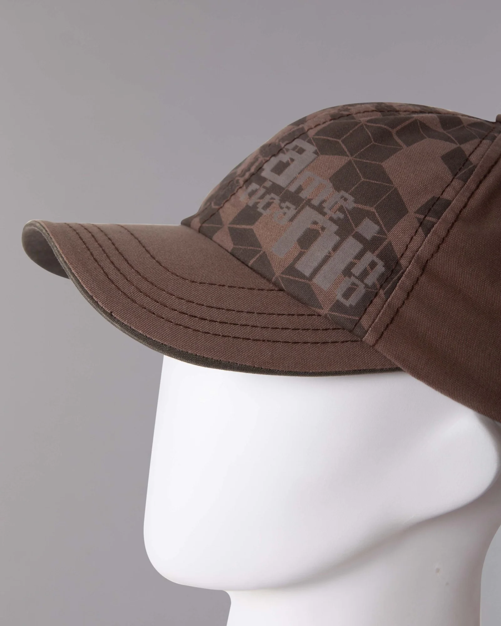 Gorra en dril procesado en tintorería con desgaste parejo, modelo seis cascos frente suave, visera curva con inferior en contraste y costuras tres más una, cuatro ojáleles bordados, regulador trasero con velcro adhesivo, estampado en el frente base agua mate