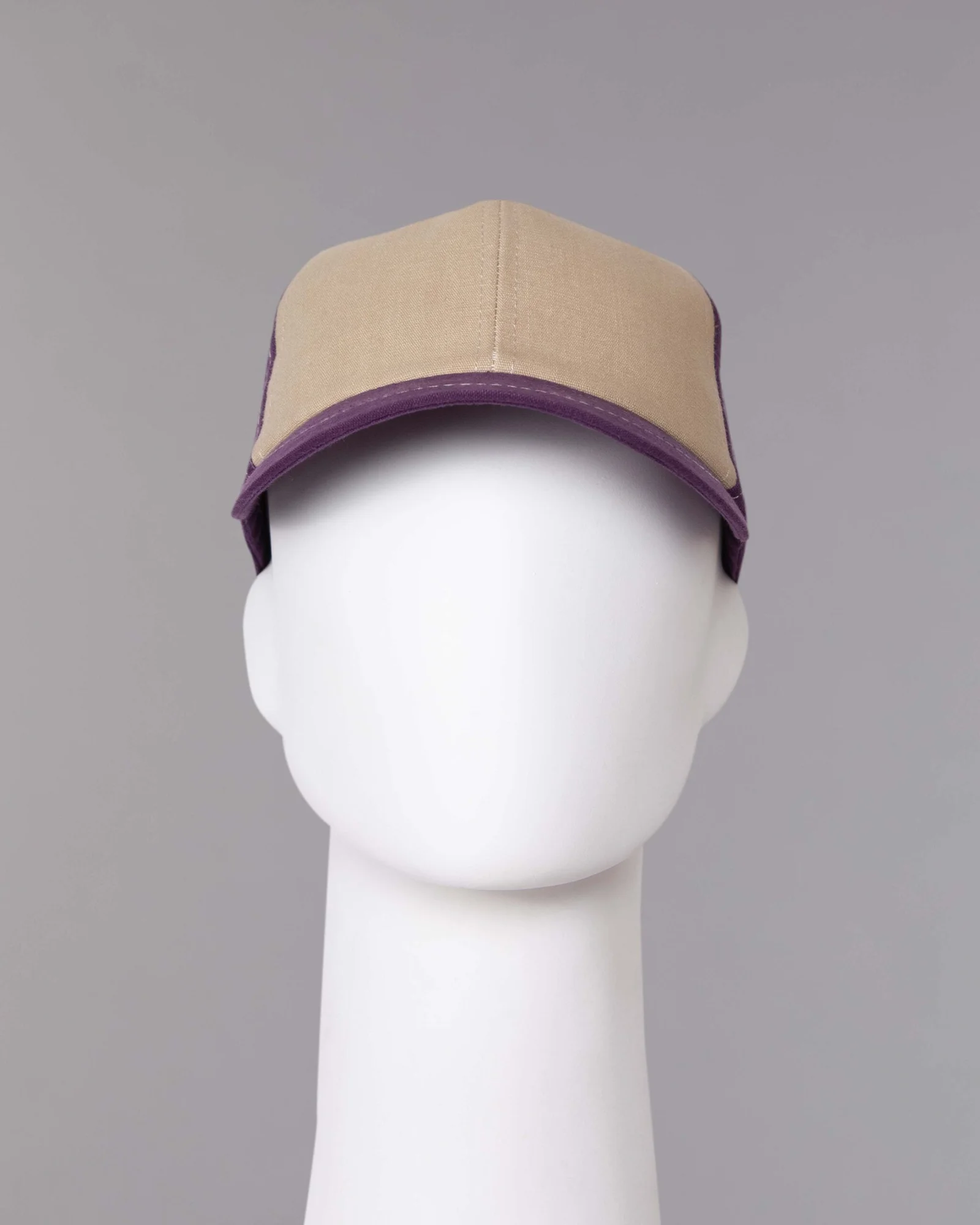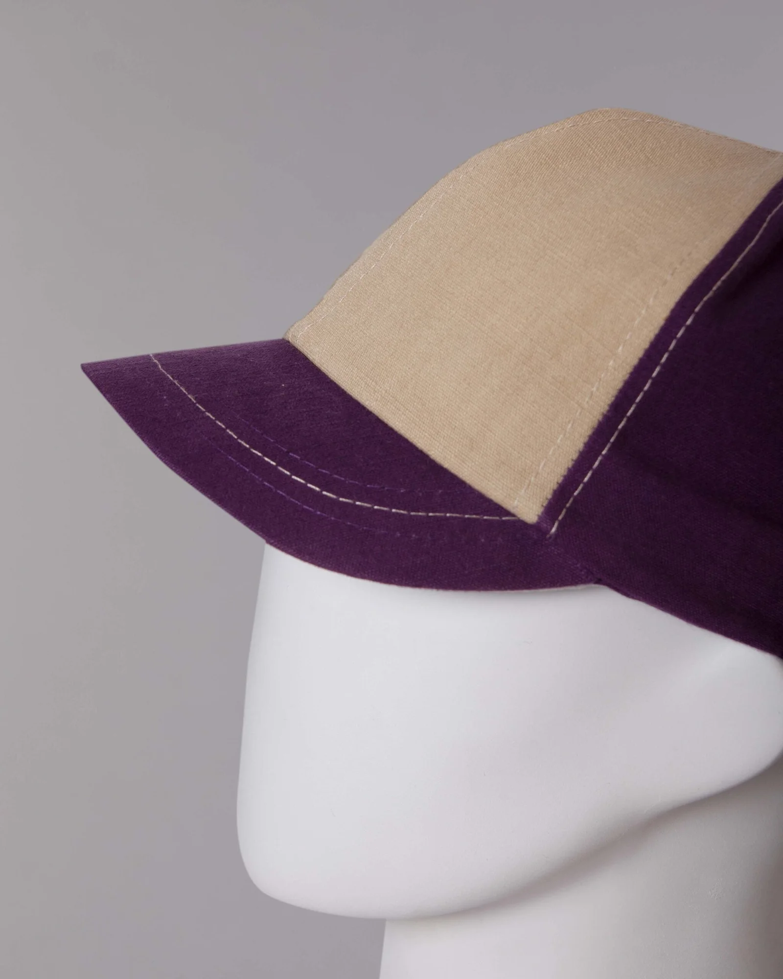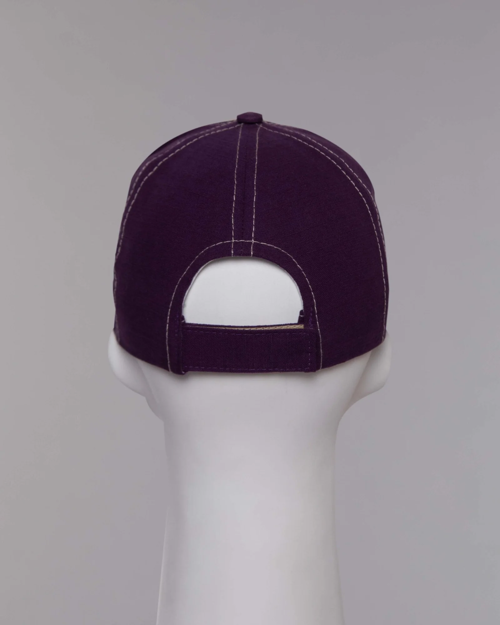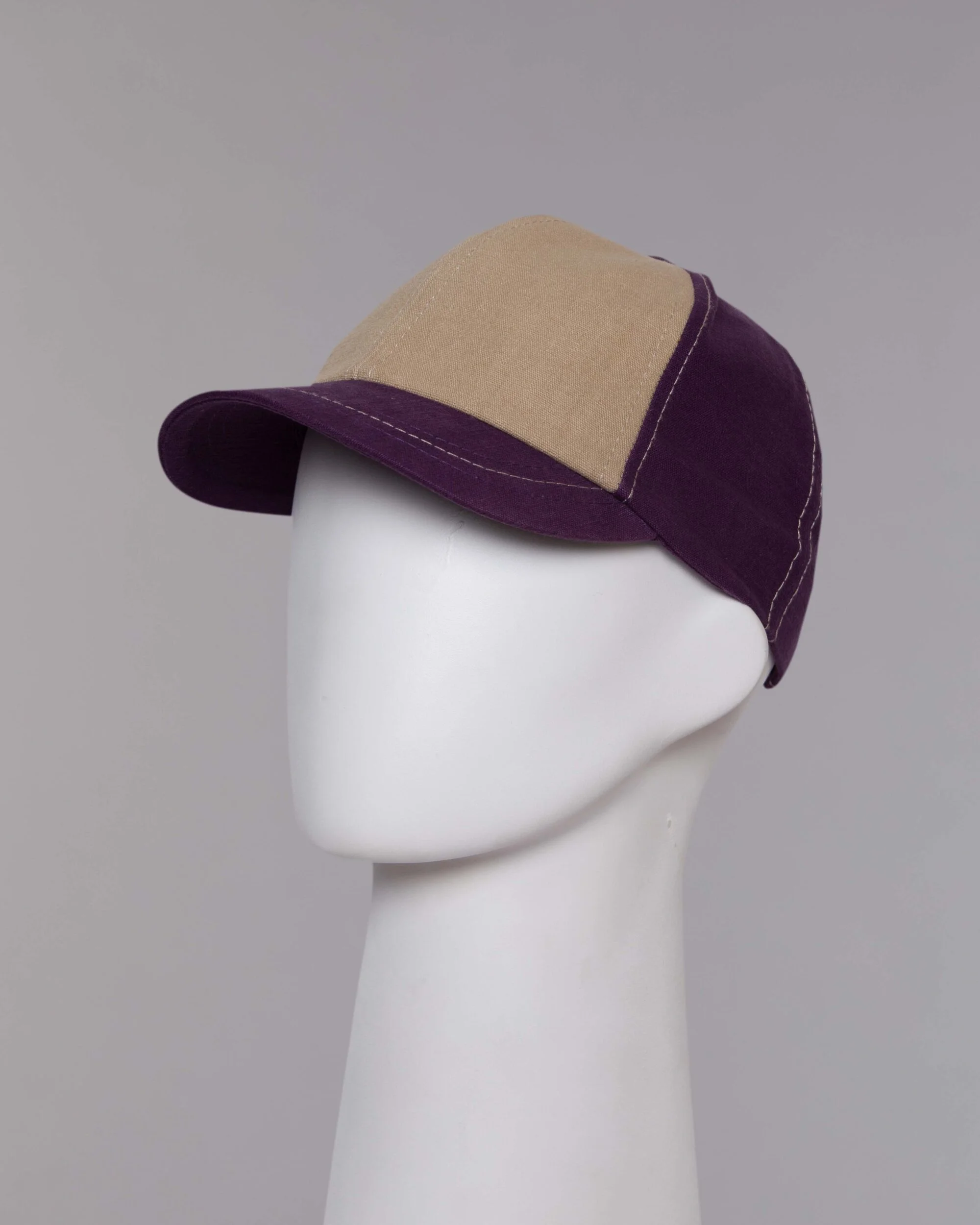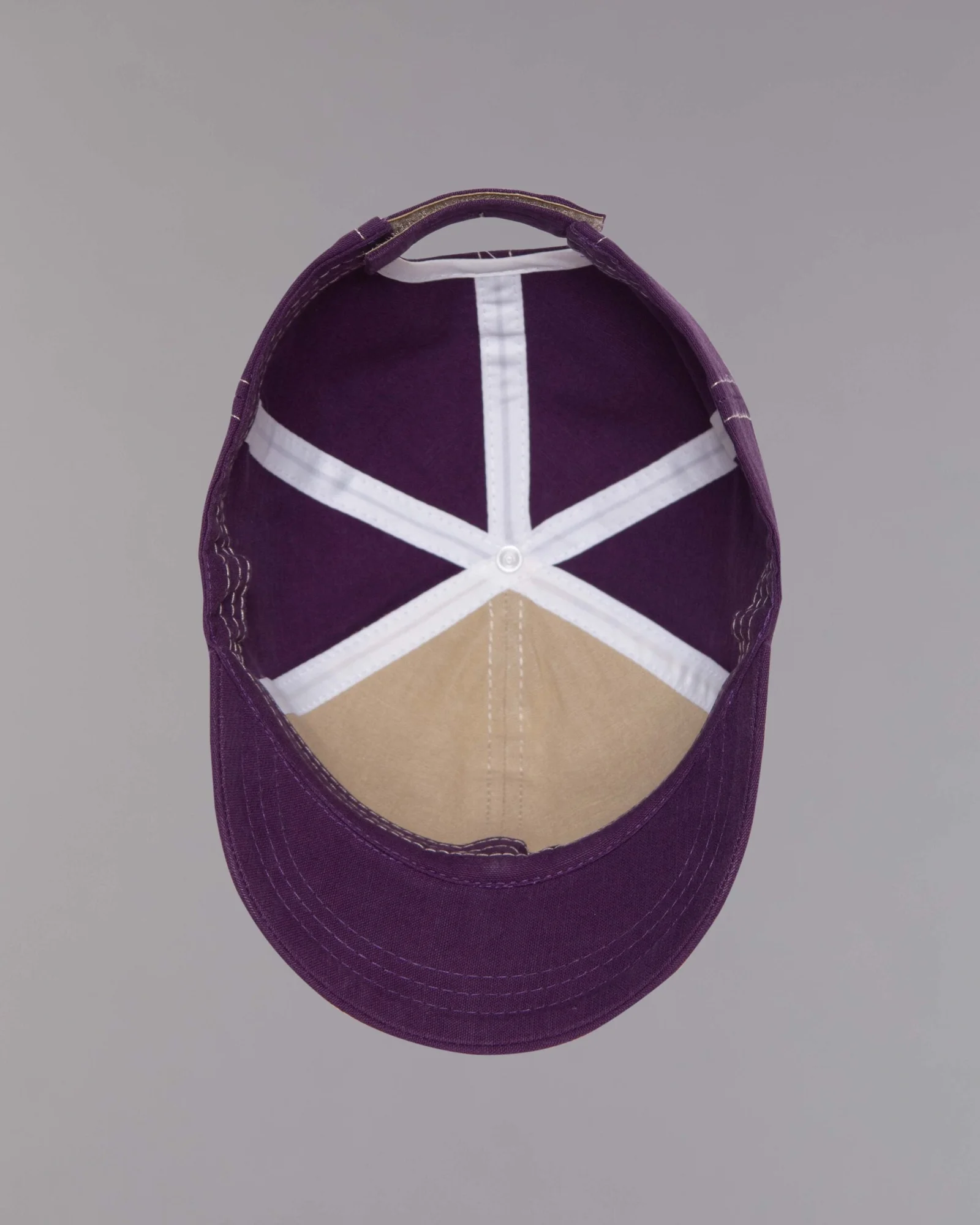 Gorra en dril tinturado morado, seis cascos frente duro y forro en la misma tela en contraste, visera corta militar poco convencional para este modelo, regulador con velcro adhesivo, costuras en contraste