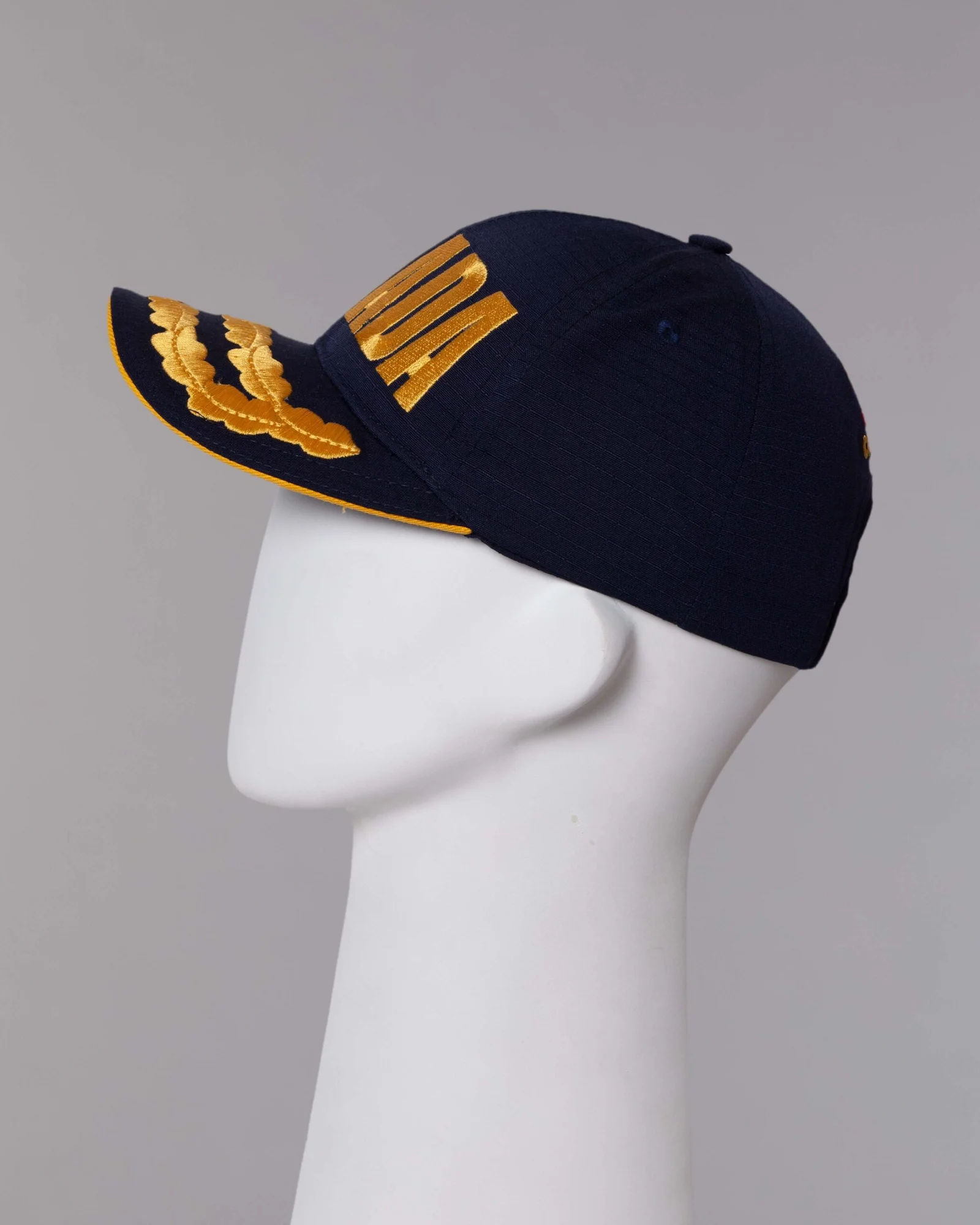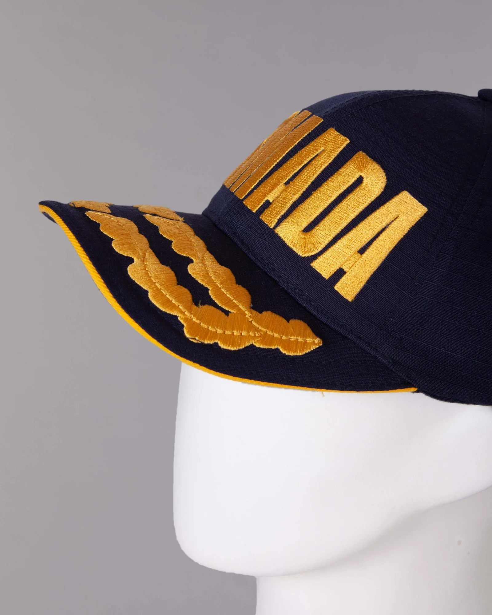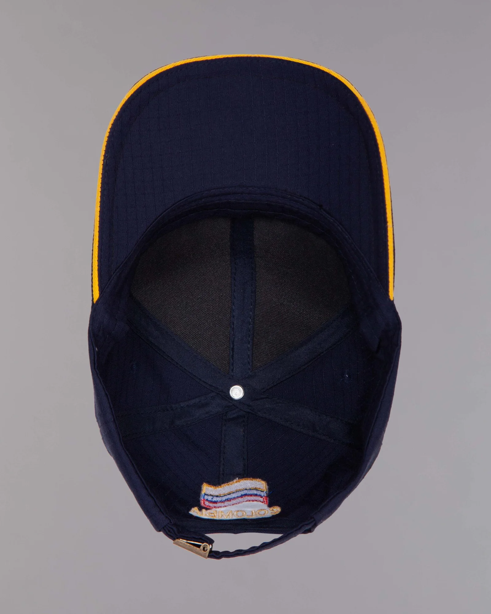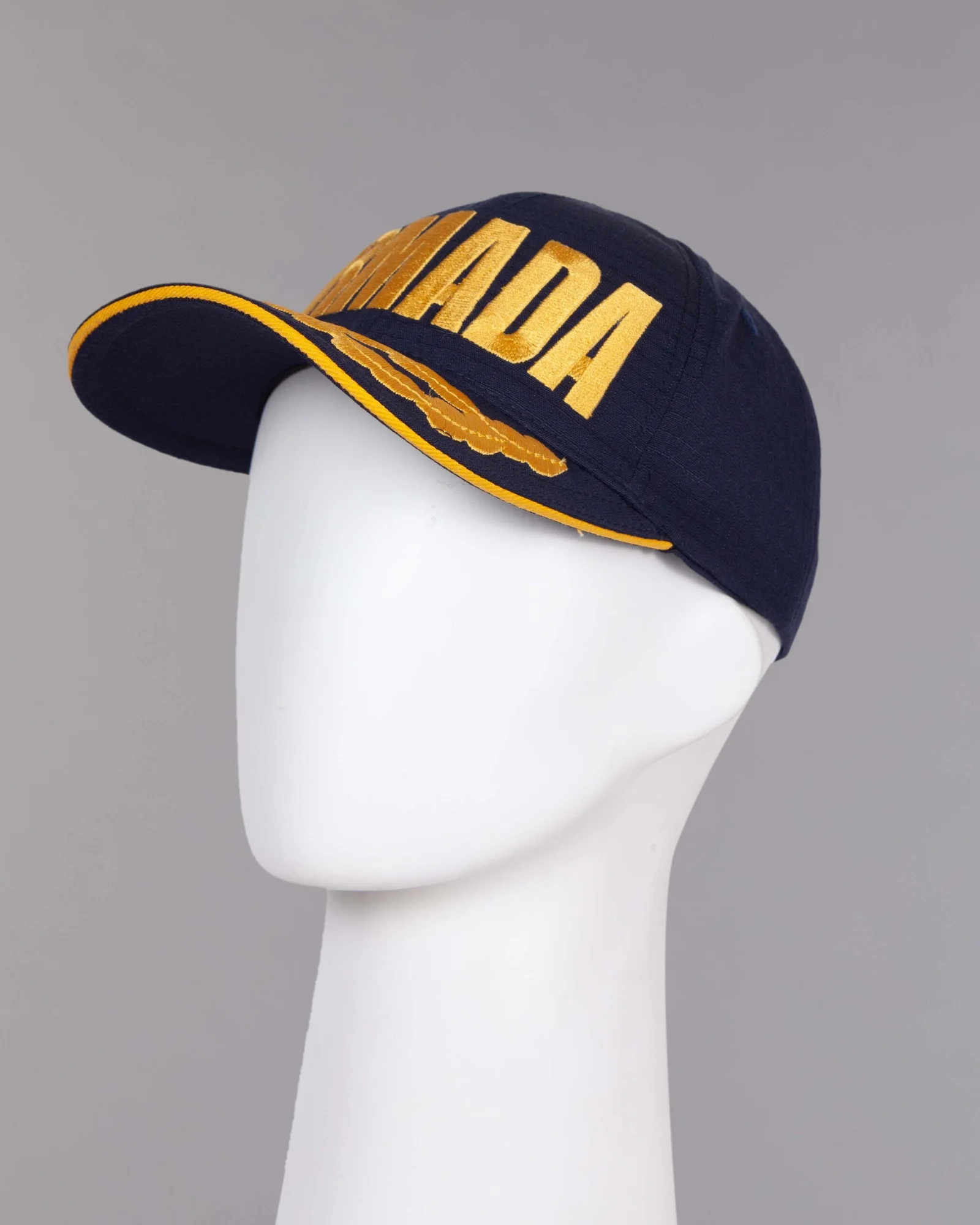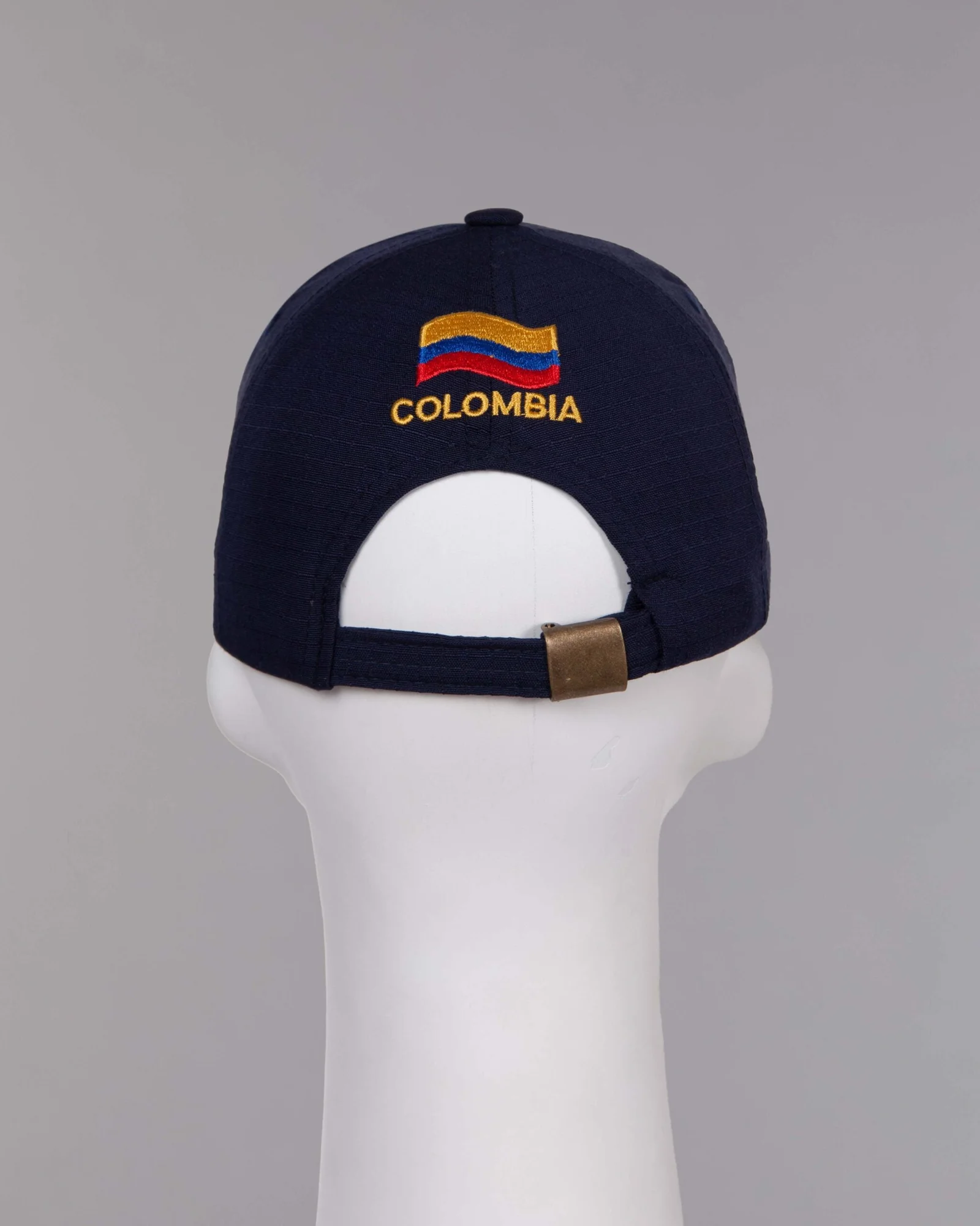 Gorra en tela Segal Wicking de Lafayette, Rip Stop, seis cascos frente duro, dos ojáleles bordados, regulador trasero, hebilla metálica, visera con sánduche en contraste, bordado doble laurel en la visera, bordado frente ARMADA y bordado trasero bandera Colombia