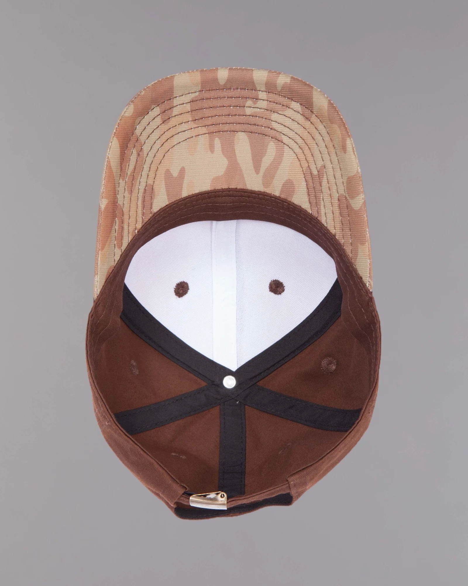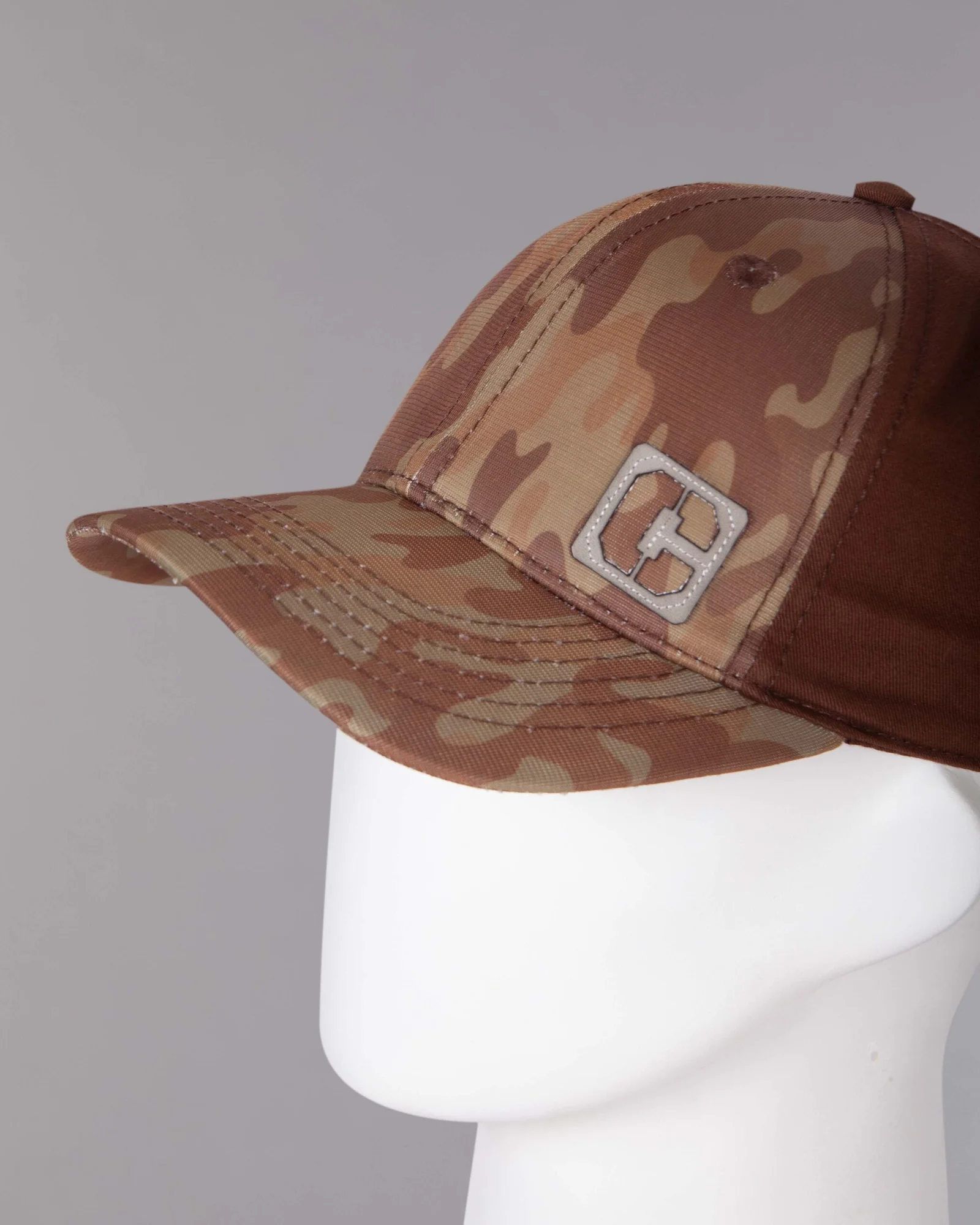 Gorra en tela Viotto con sublimacion digital camuflado café, laterales y trasero en dril tinturado, seis cascos frente duro, seis ojaletes bordados, visera curva con seis costuras, regulador trasero hebilla metálica, aplique de cuero cortado láser y bordado