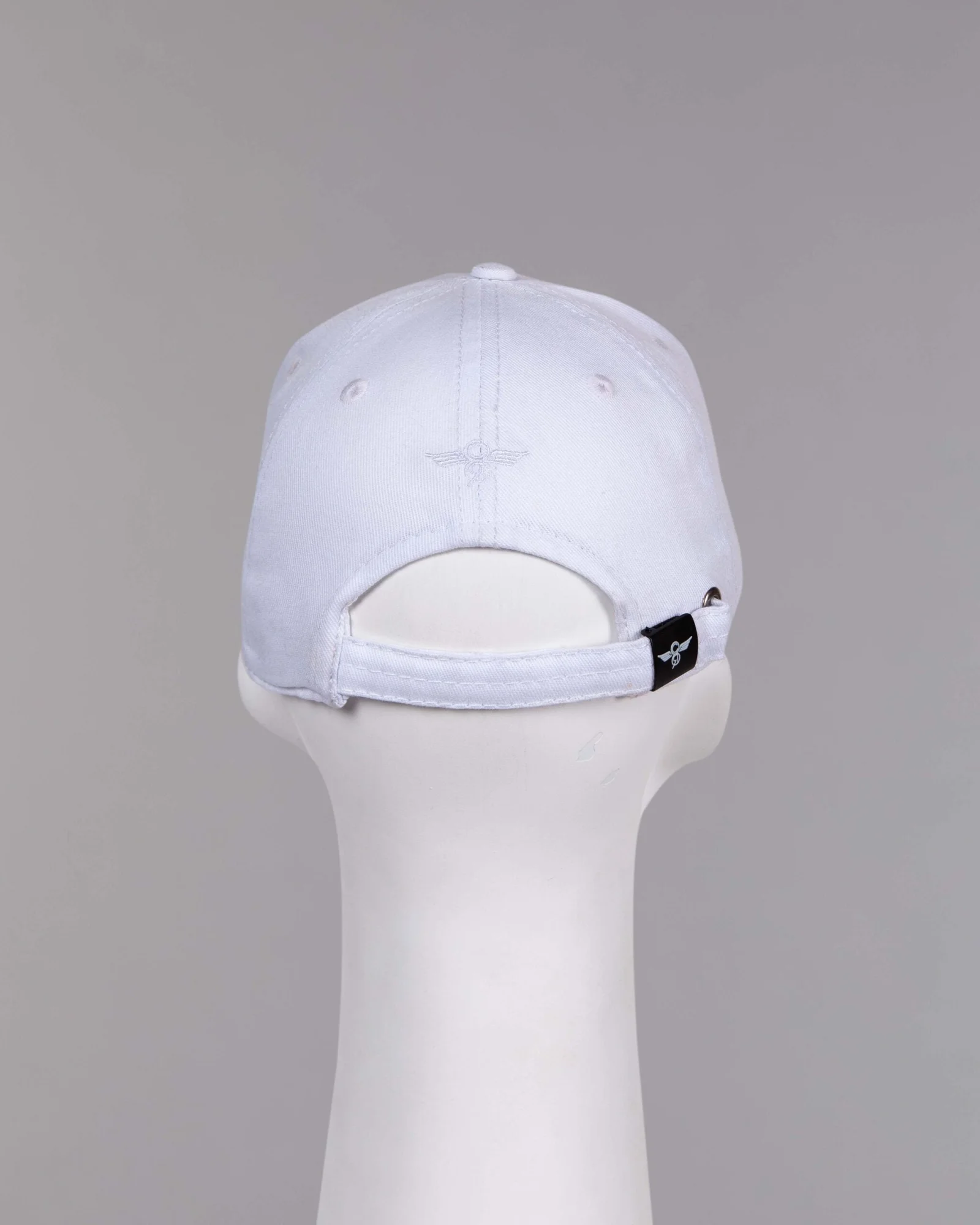 Gorra en dril algodón tinturado blanco, modelo cinco cascos frente duro, seis ojáleles bordados al tono, regulador trasero hebilla metálica contramarcada, frente estampado en alto relieve, lateral izquierdo estampado alto relieve, bordado visera en alto relieve y bordado trasero normal, forro interno en el frente estampado y sesgo interno estampado