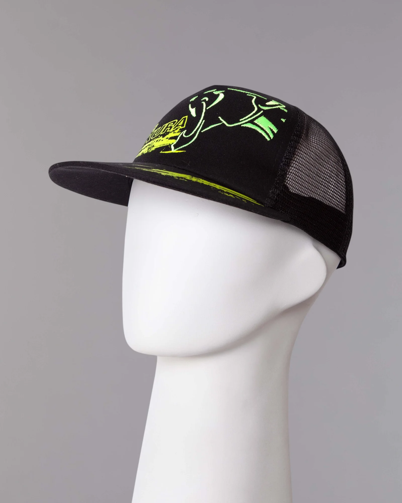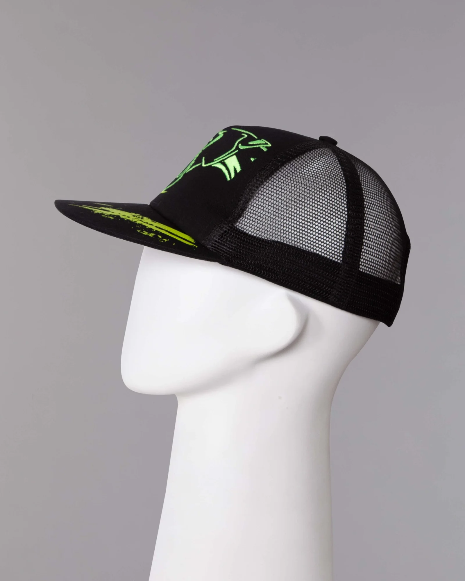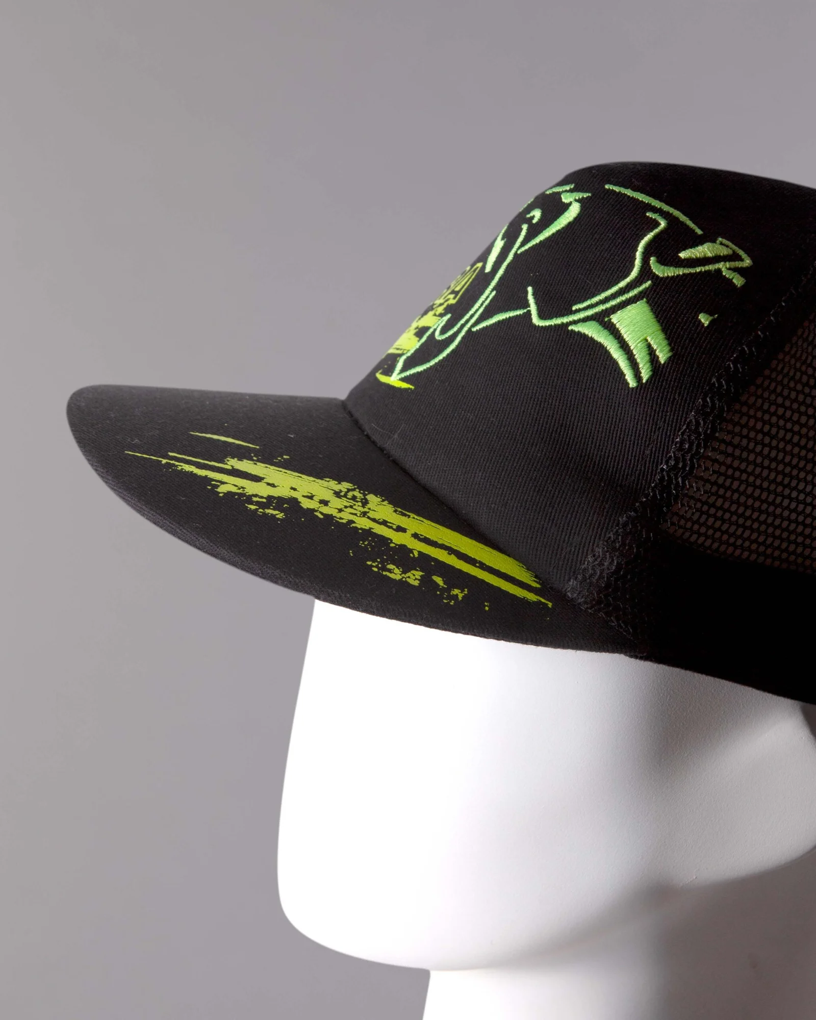 Gorra en dril algodón modelo cinco cascos frente duro, visera plana sin costuras, trasero en malla, regulador trasero en velcro con estampado, frente bordado mas estampado, visera estampada