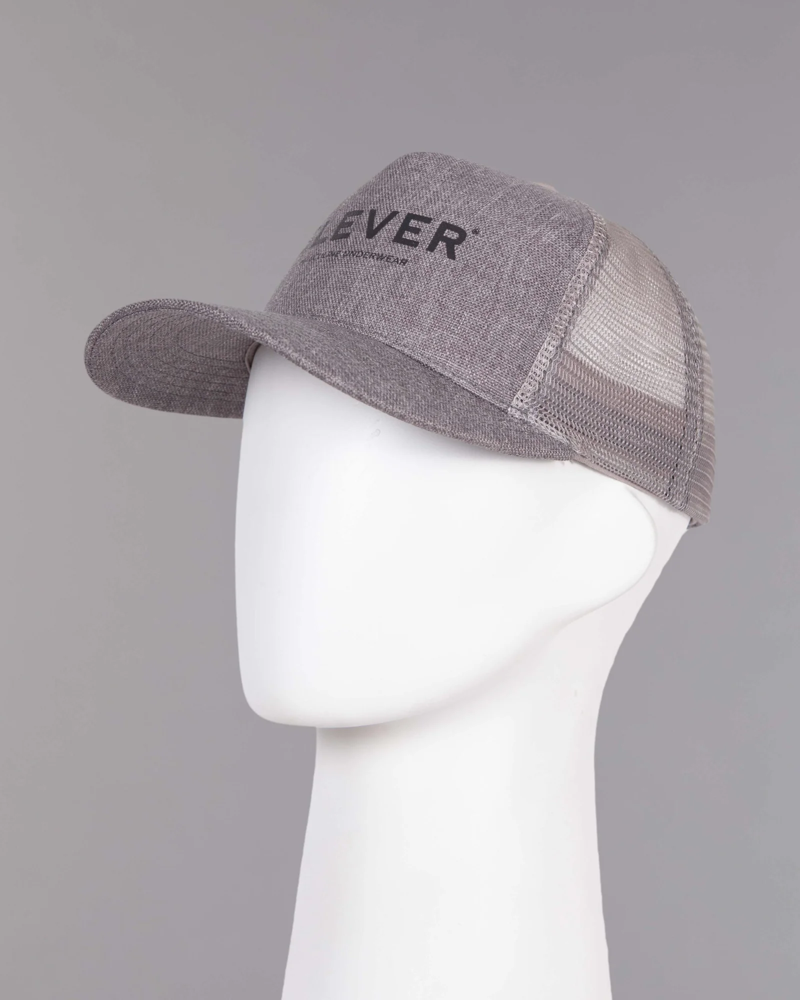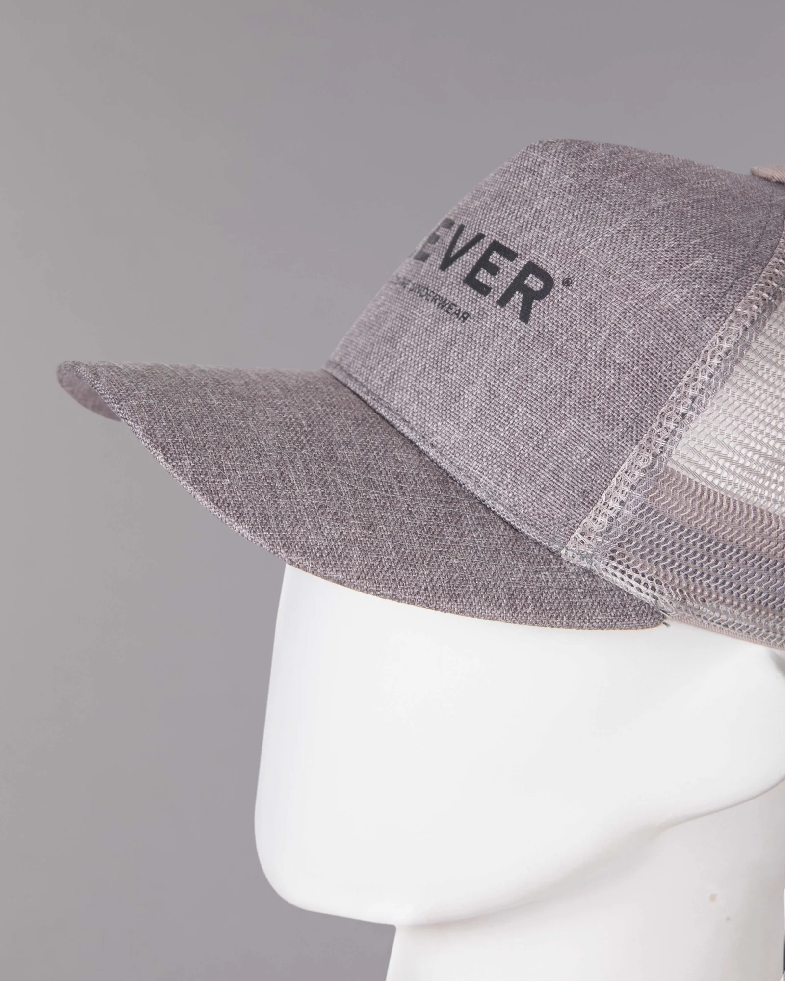 Gorra en lino poliester jaspeado, modelo cinco cascos camionera con malla trasera, regulador correa plastica, visera curva con seis costuras, estampado frente CLEVER