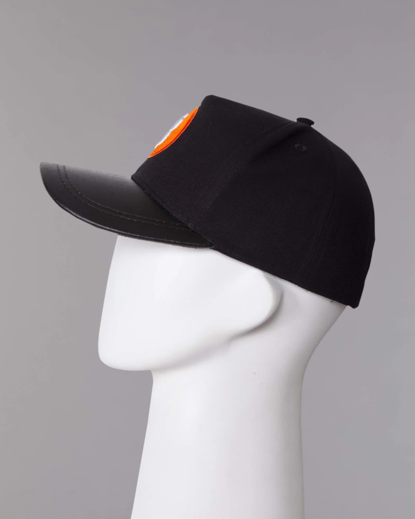 Gorra en lona negra algodón, modelo cinco cascos frente duro, visera curva en cuero natural con dos costuras, cuatro ojáleles bordados al tono, regulador trasero con hebilla contramarcada y correa de cuero, sesgo interno y forro interno estampado, bordado en el frente todo relleno y realce alto relieve
