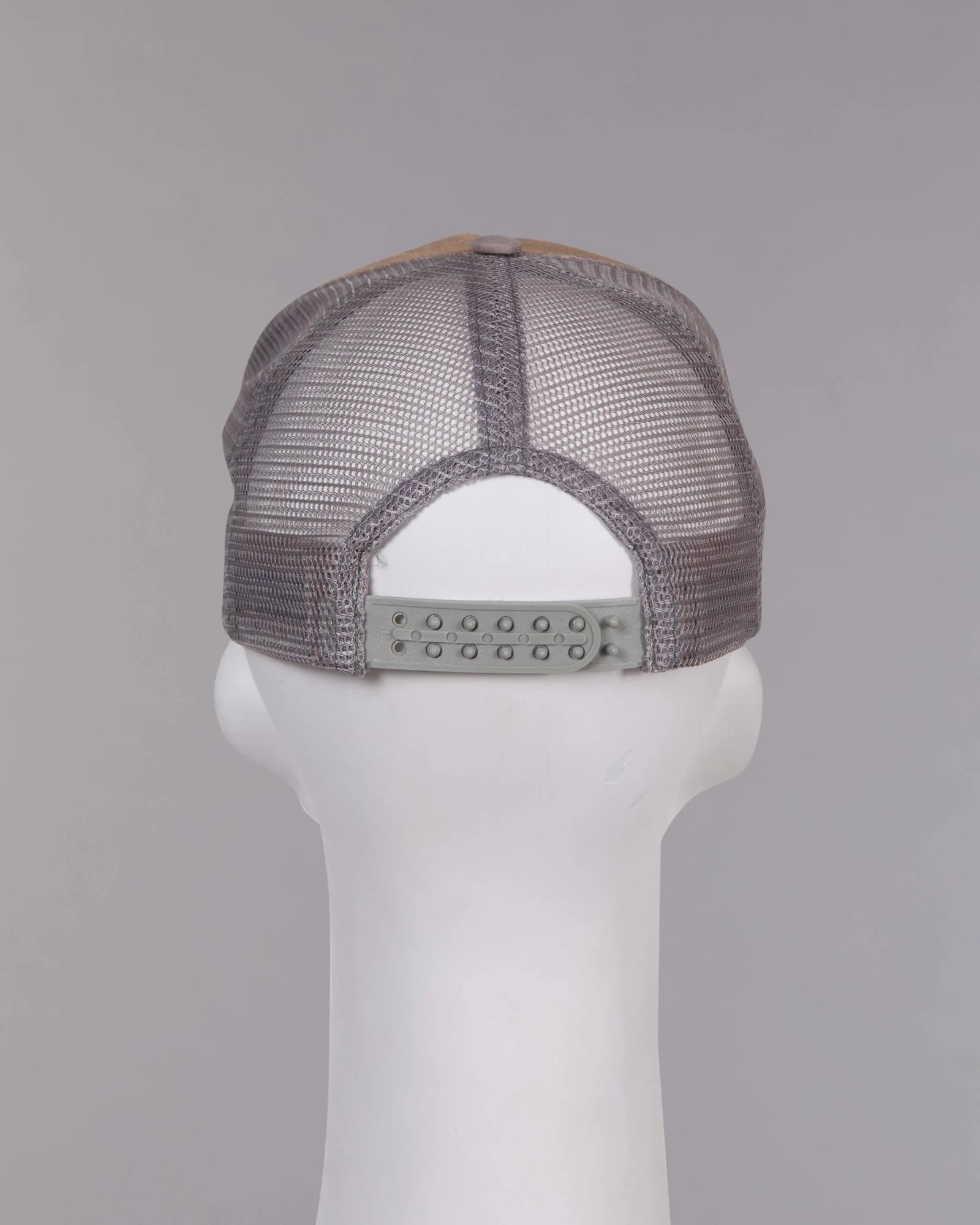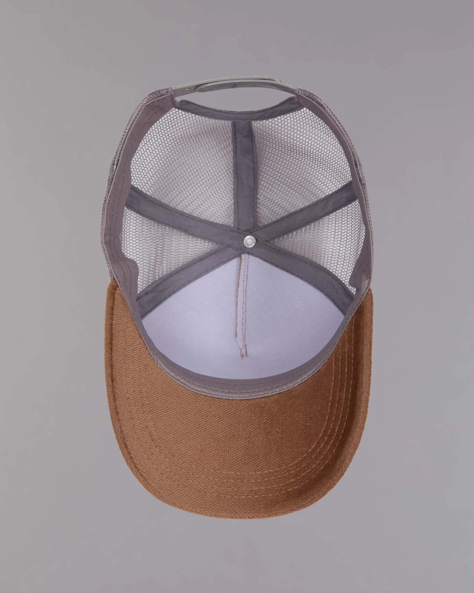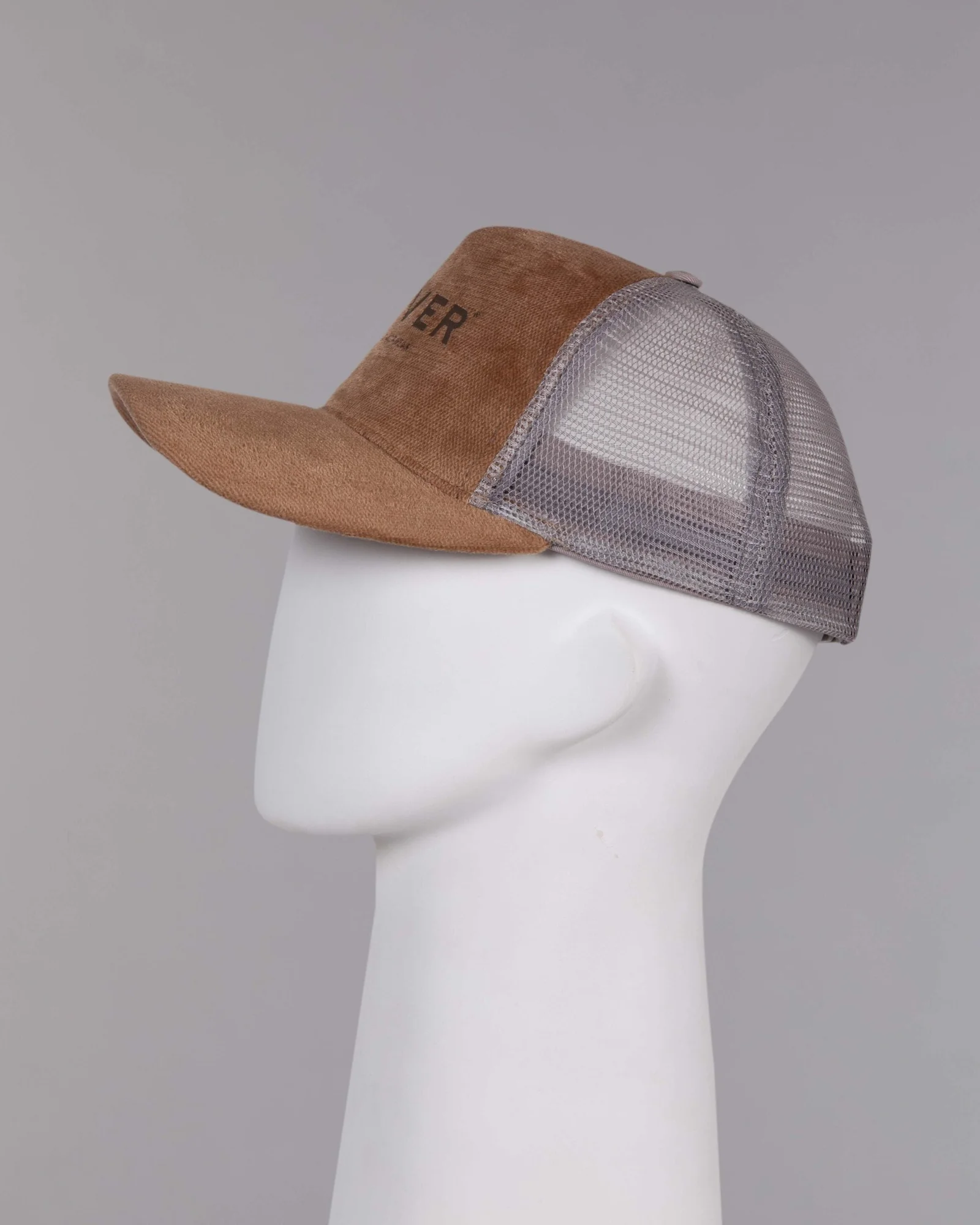 Gorra en sintético tipo gamuza, cinco cascos frente duro, camionera con trasero en malla, visera curva con cuatro costuras, regulador trasero, correa plástica y grabado láser en el frente