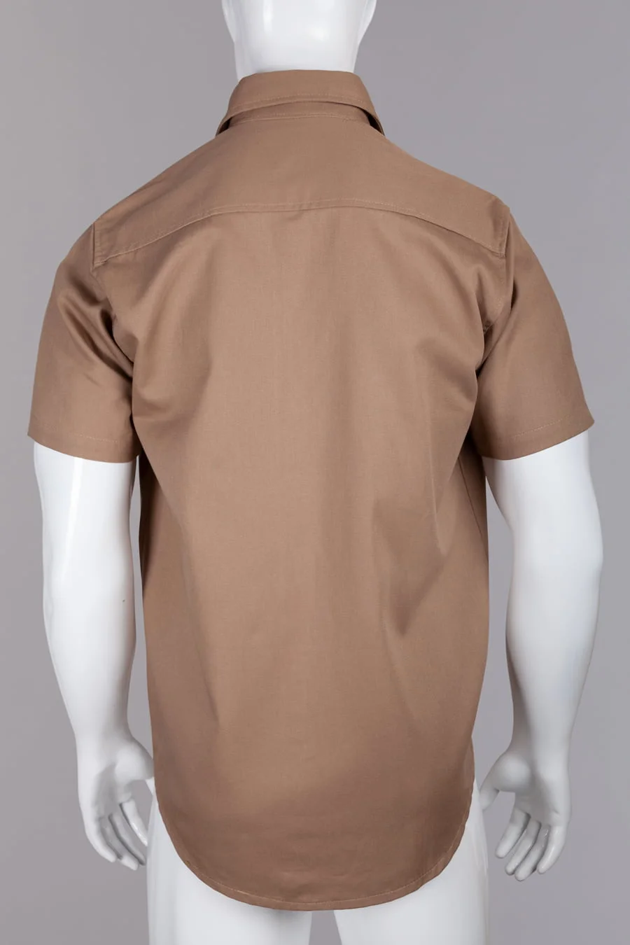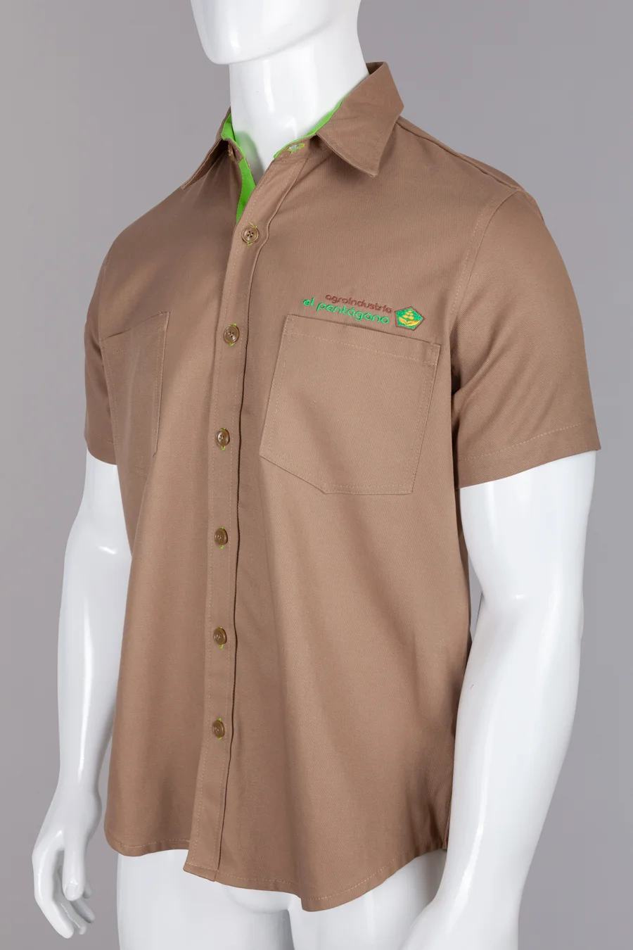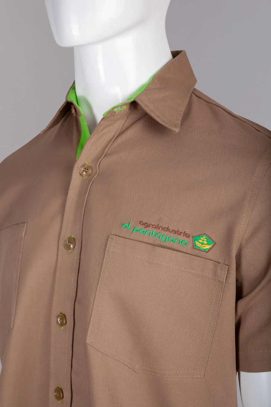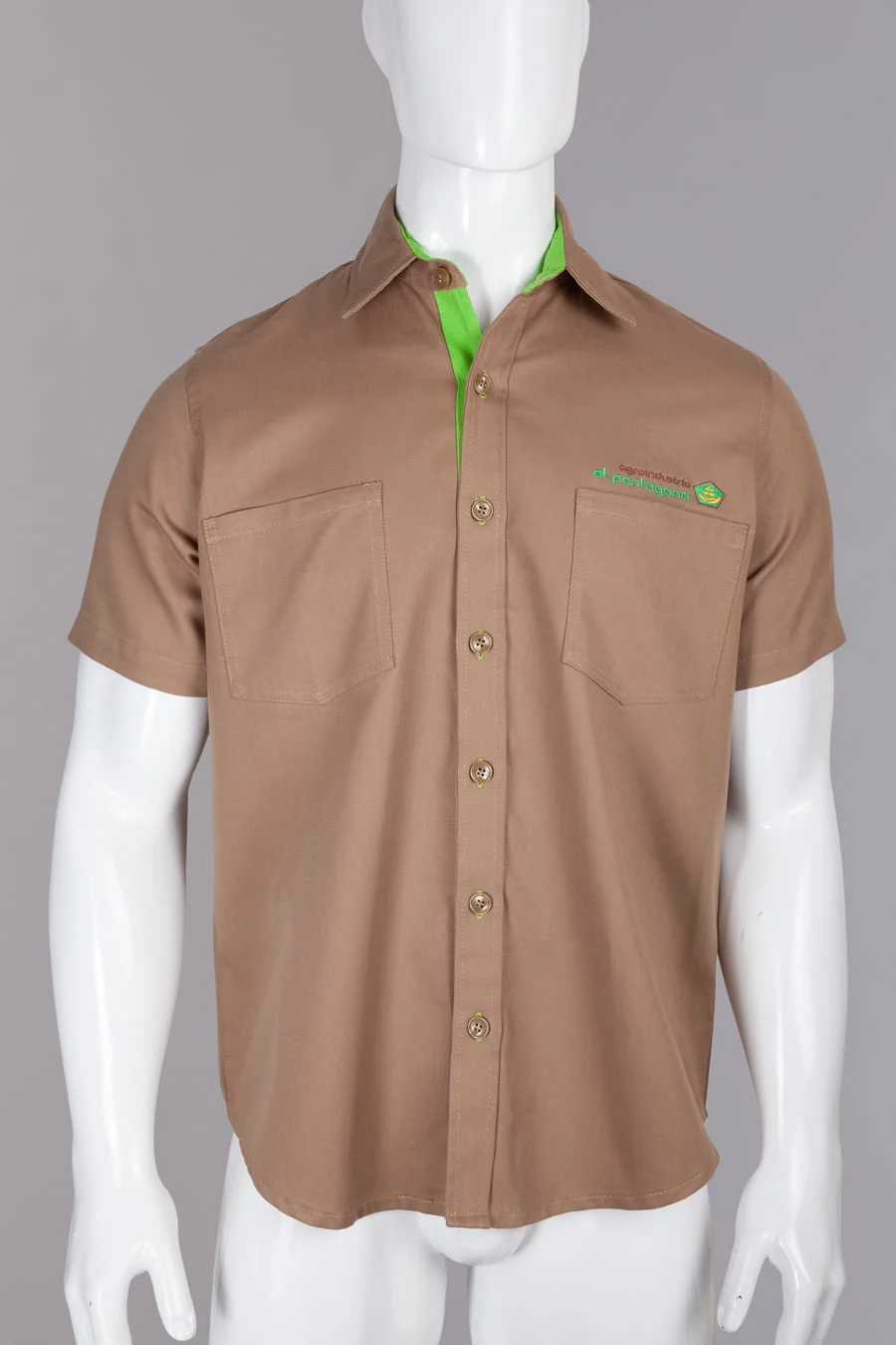 Camisa en dril algodon, manga corta y cuello camisero, ajuste con botones y perilla en contraste verde, dos bolsillos frontales, bordado arriba del bolsillo