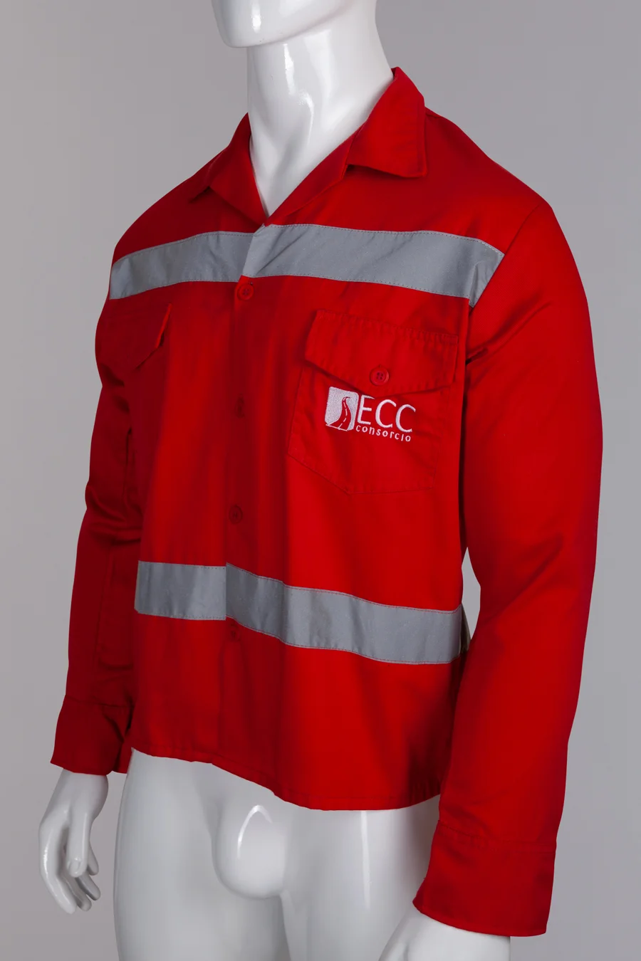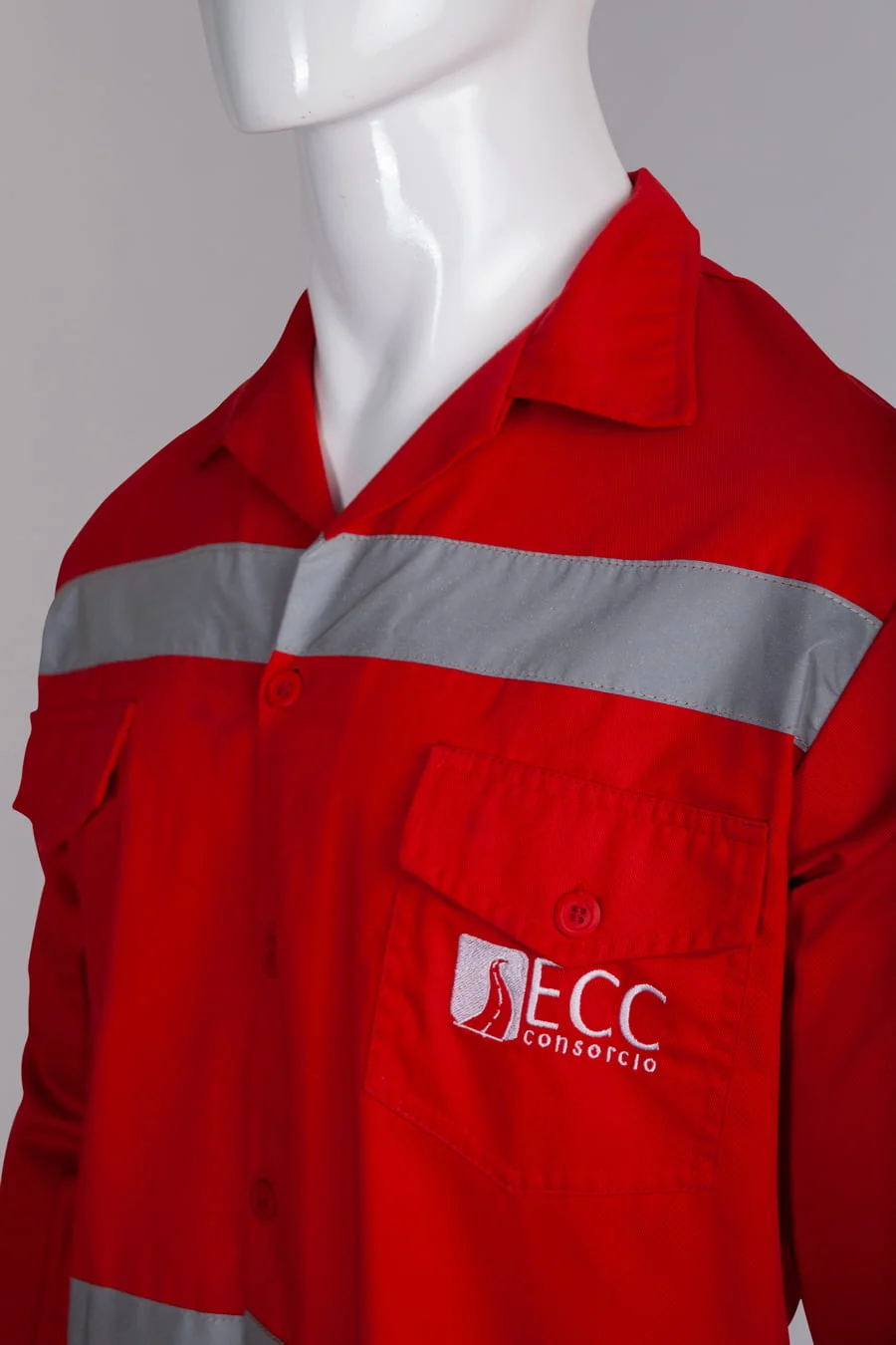 Camisa en dril liviano o gabardina, cuello camisero y ajuste con botones, doble cinta reflectiva de dos pulgadas en frente y espalda, manga larga con puño con boton, dos bolsillos en el frente con tapa y boton