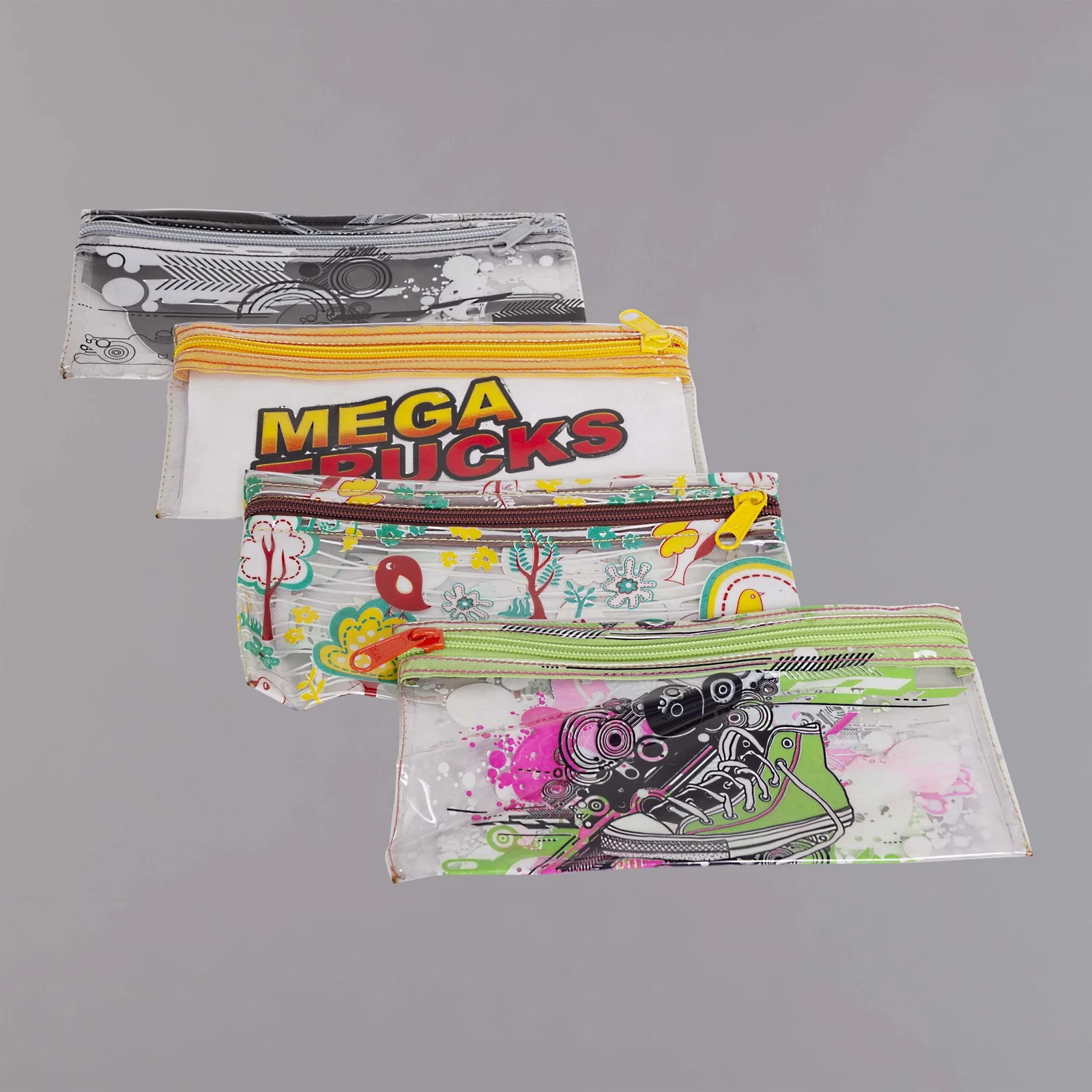 Cartucheras en vinilo transparente con estampado en policromía y con cremallera.