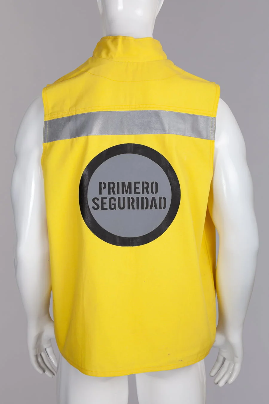 Chaleco en dril algodon, cuello alto, con cinta reflectiva de dos pulgadas en el frente y en la espalda, cuatro bolsillos inferiores, uno interno y uno externo de parche, estampado en la espalda con aplique reflectivo y bordado en el frente
