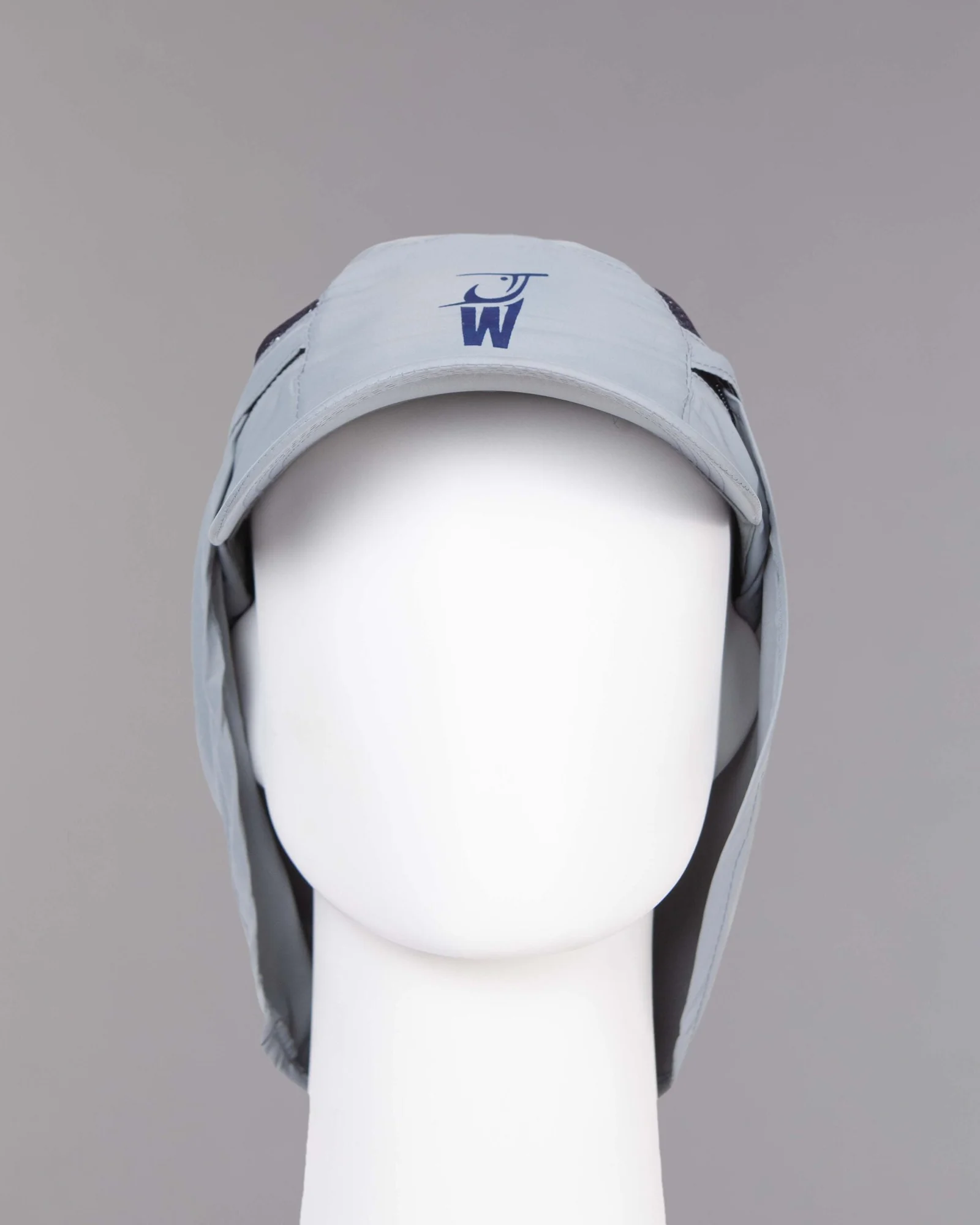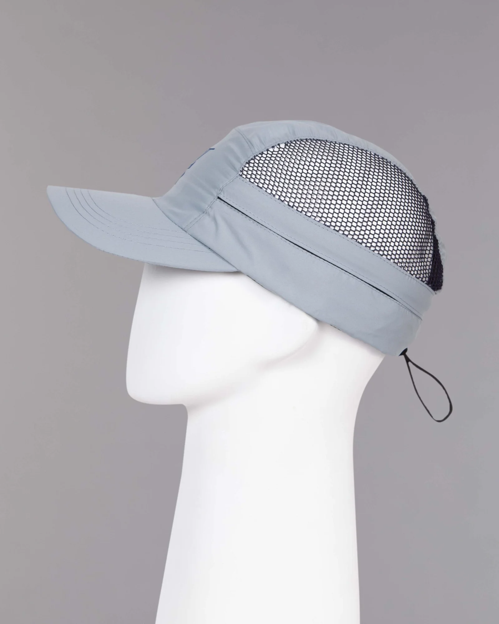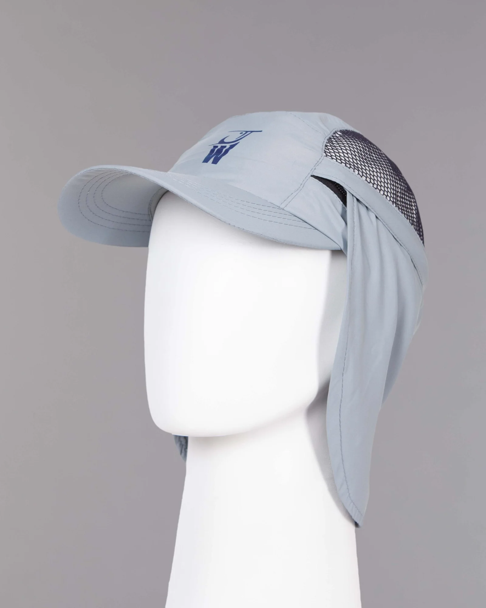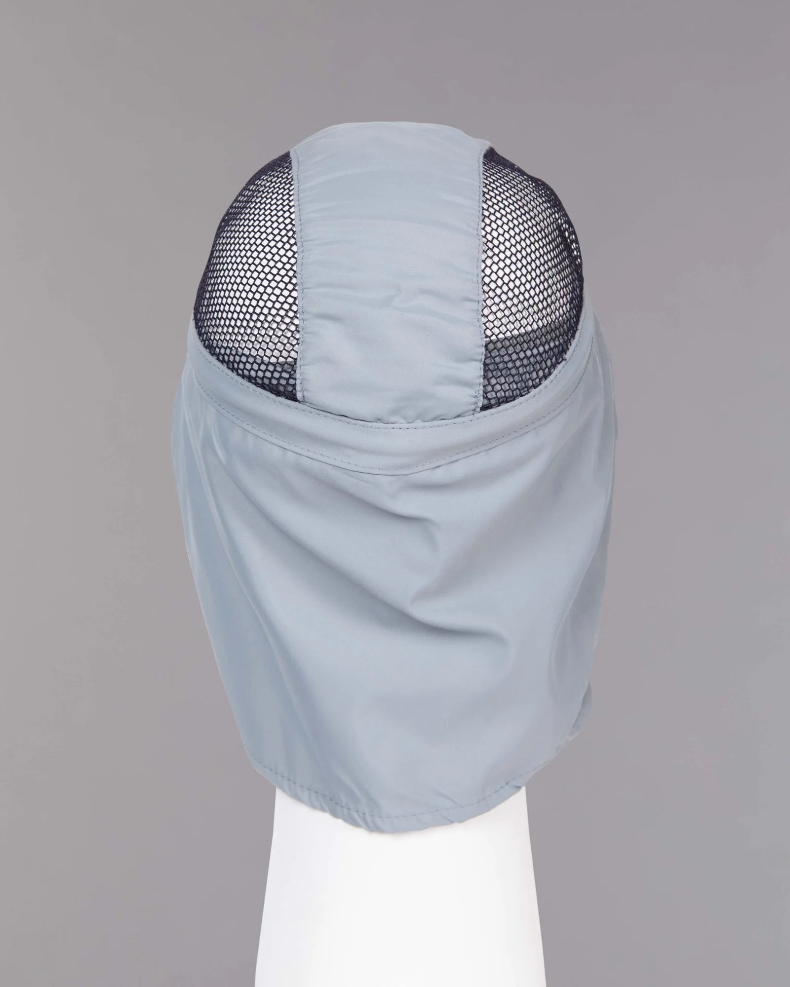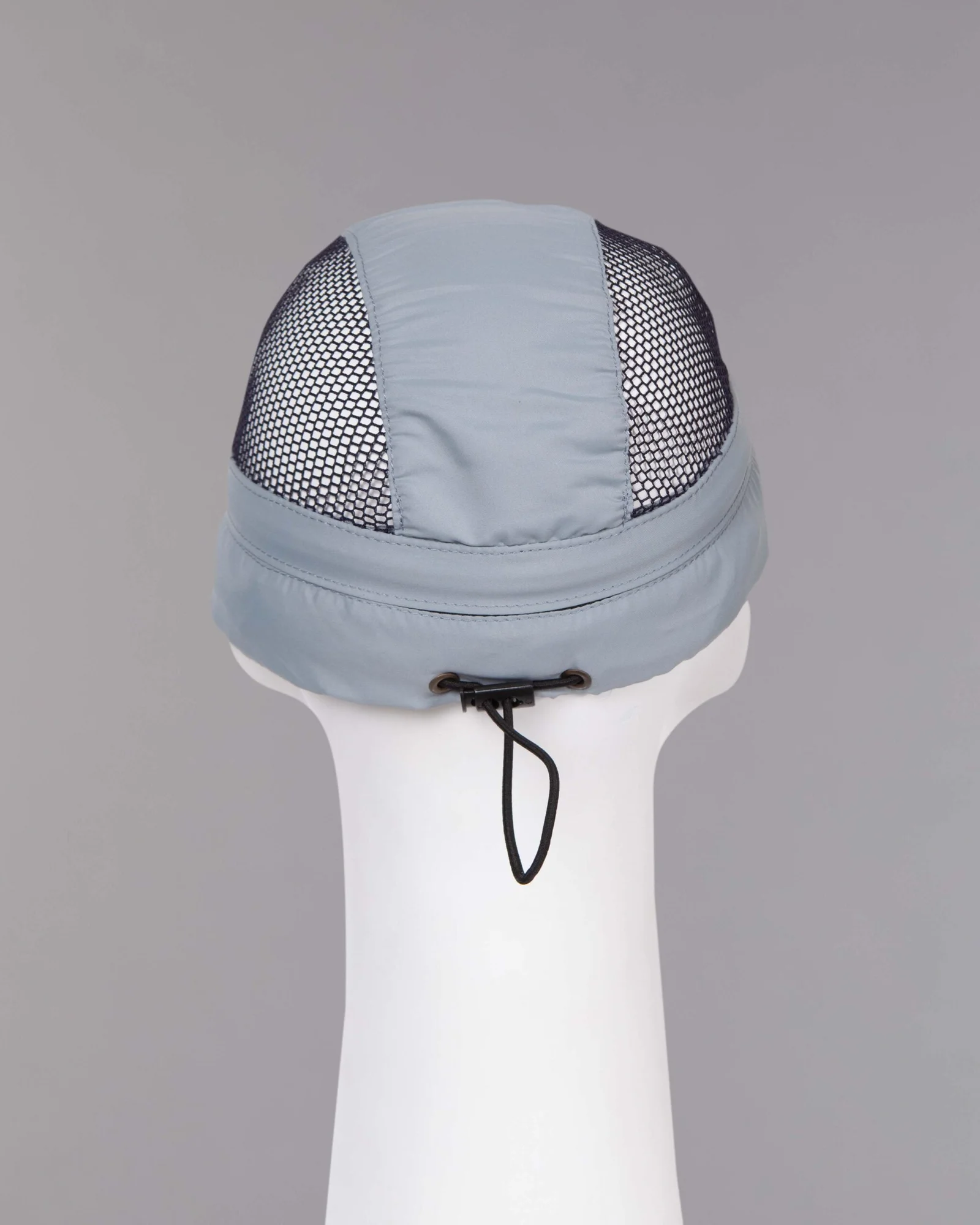 Gorra en tela antifluido, modelo ciclista con laterales en malla angeo, ESPECIAL con bolsillo con cremallera para guardar y plegar la solapa para proteger del sol. Regulador trasero cordon elástico con tensor. Diseño especial desarrollado para este cliente.