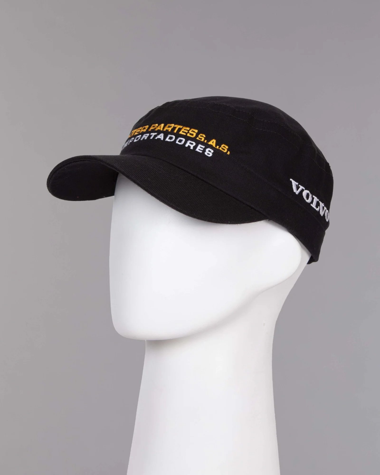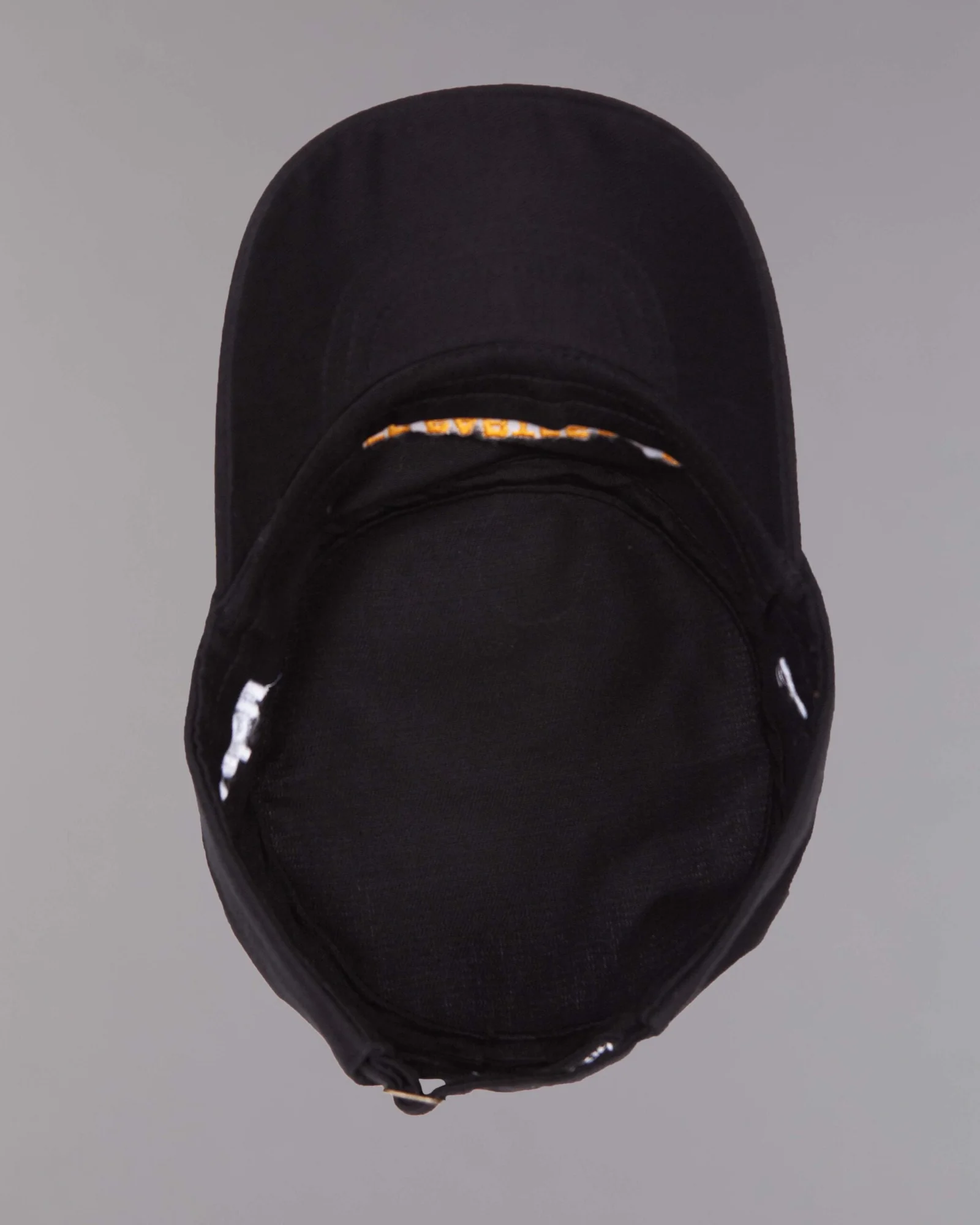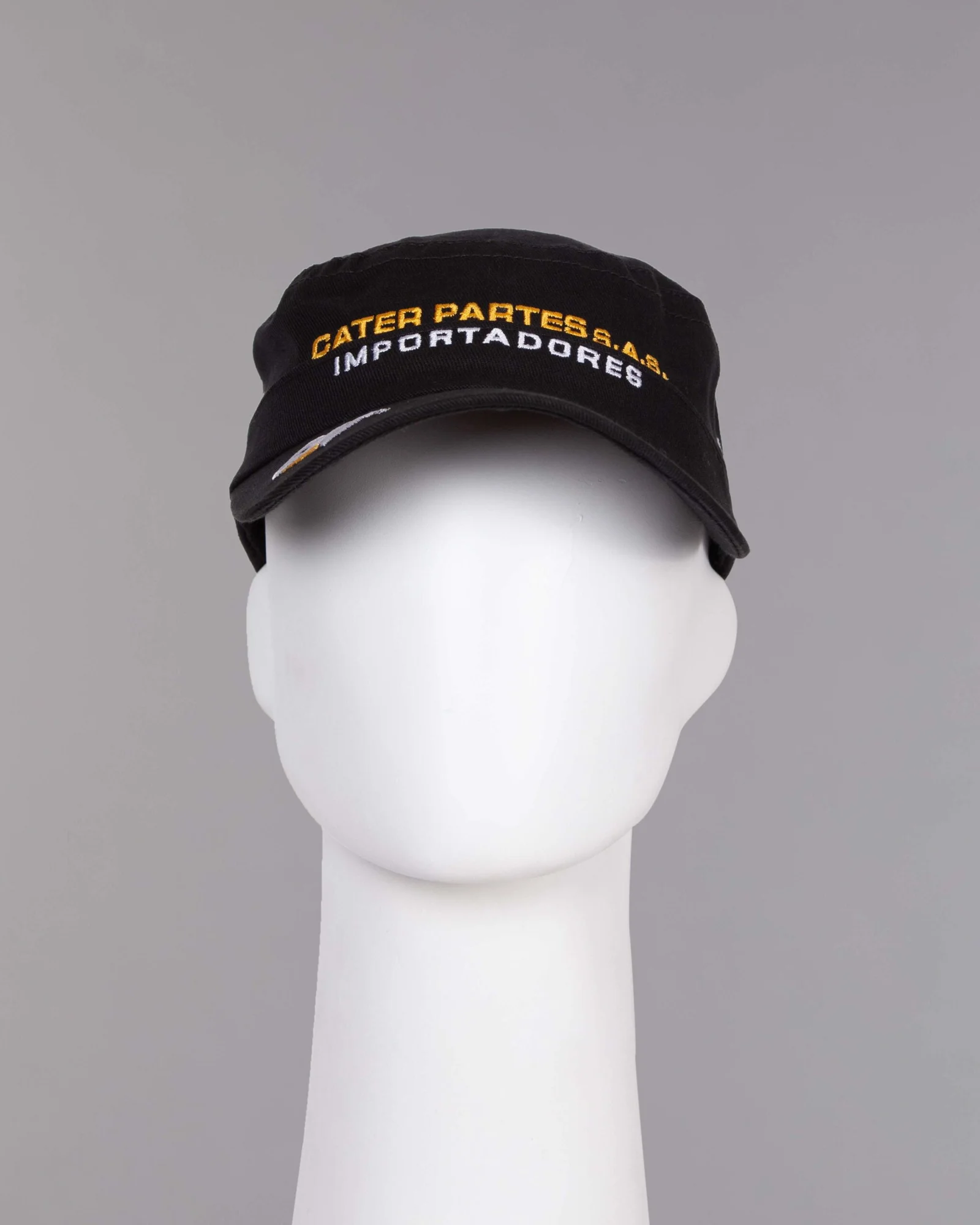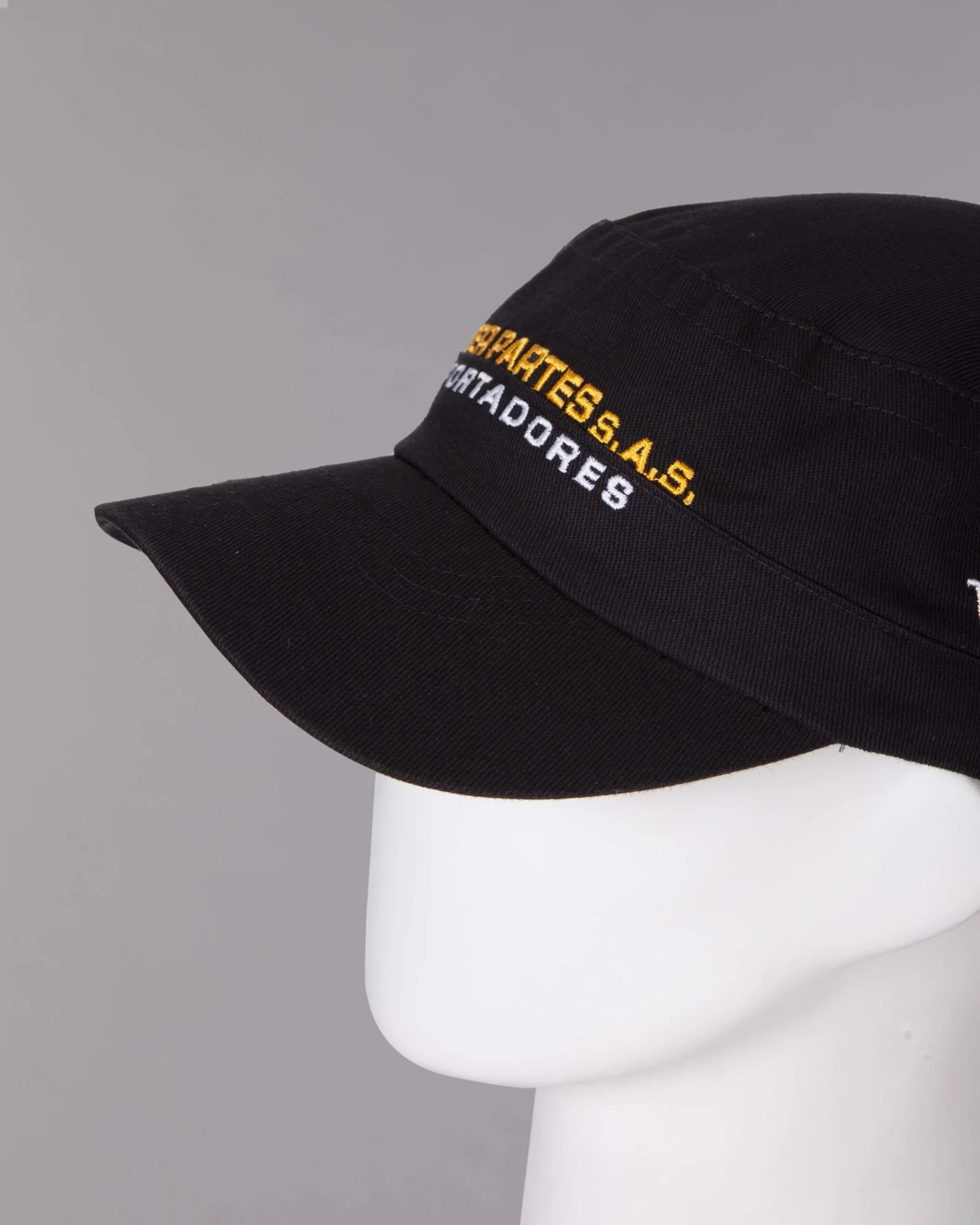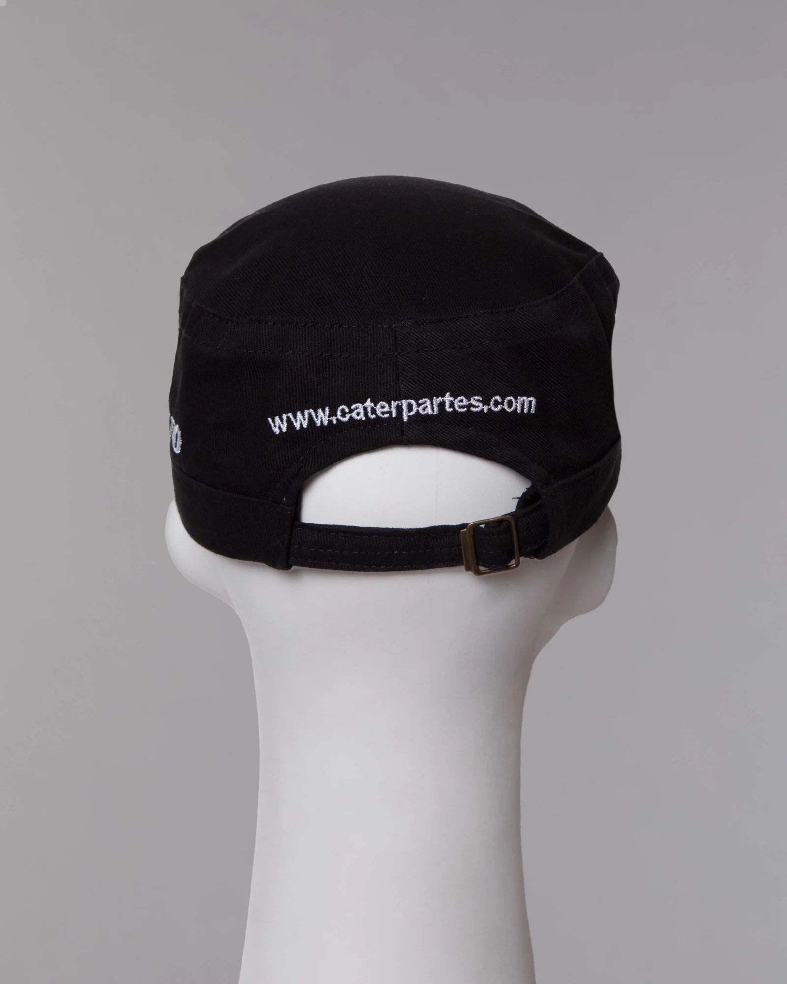 Gorra en dril negro, modelo militar goleana con banda externa y visera larga, regulador trasero trabilla metálica, bordado frente, lateral y trasero