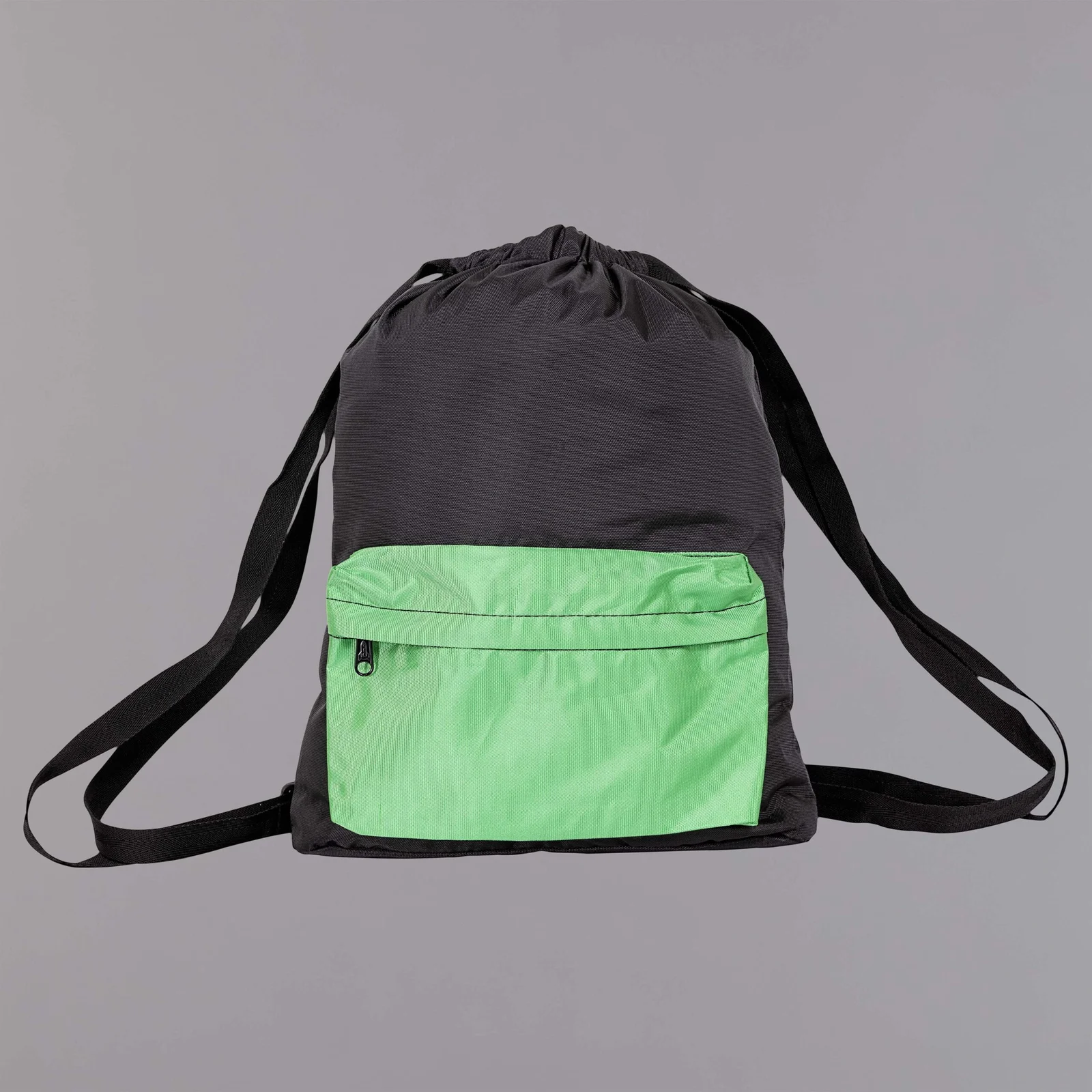Tula en lona poliester de morral con ajuste de cierre con reata tipo tula, con bolsillo frontal con fuelle de cremallera.