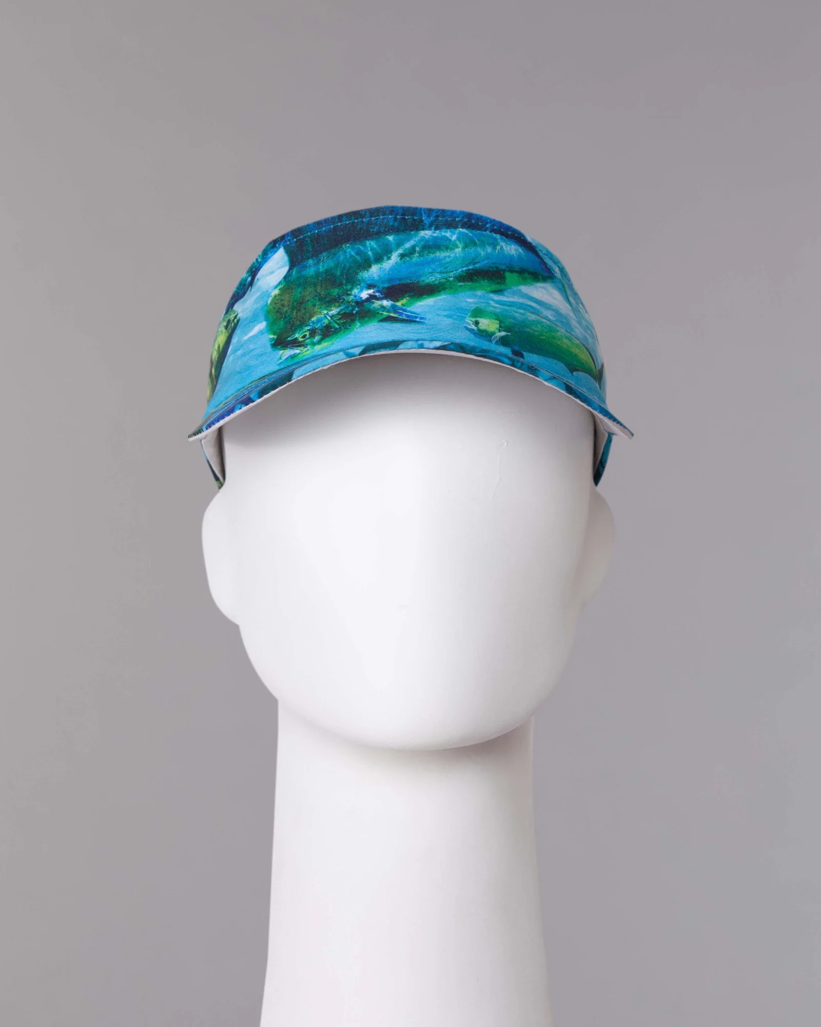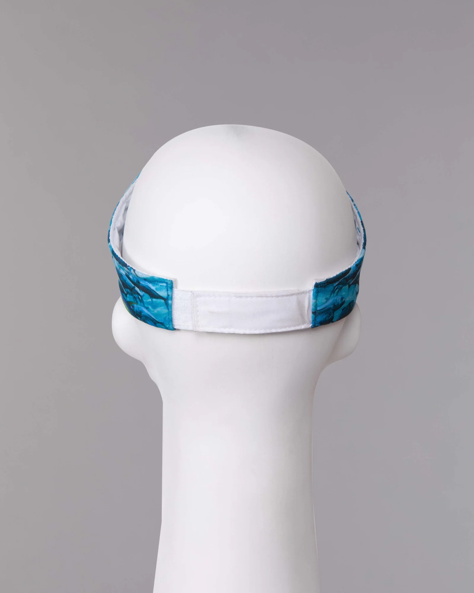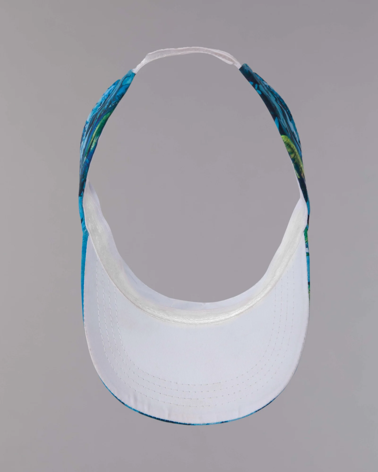 Visera en tela antifluido con sublimación digital, visera inferior en contraste blanco y ajuste regulador trasero velcro adhesivo