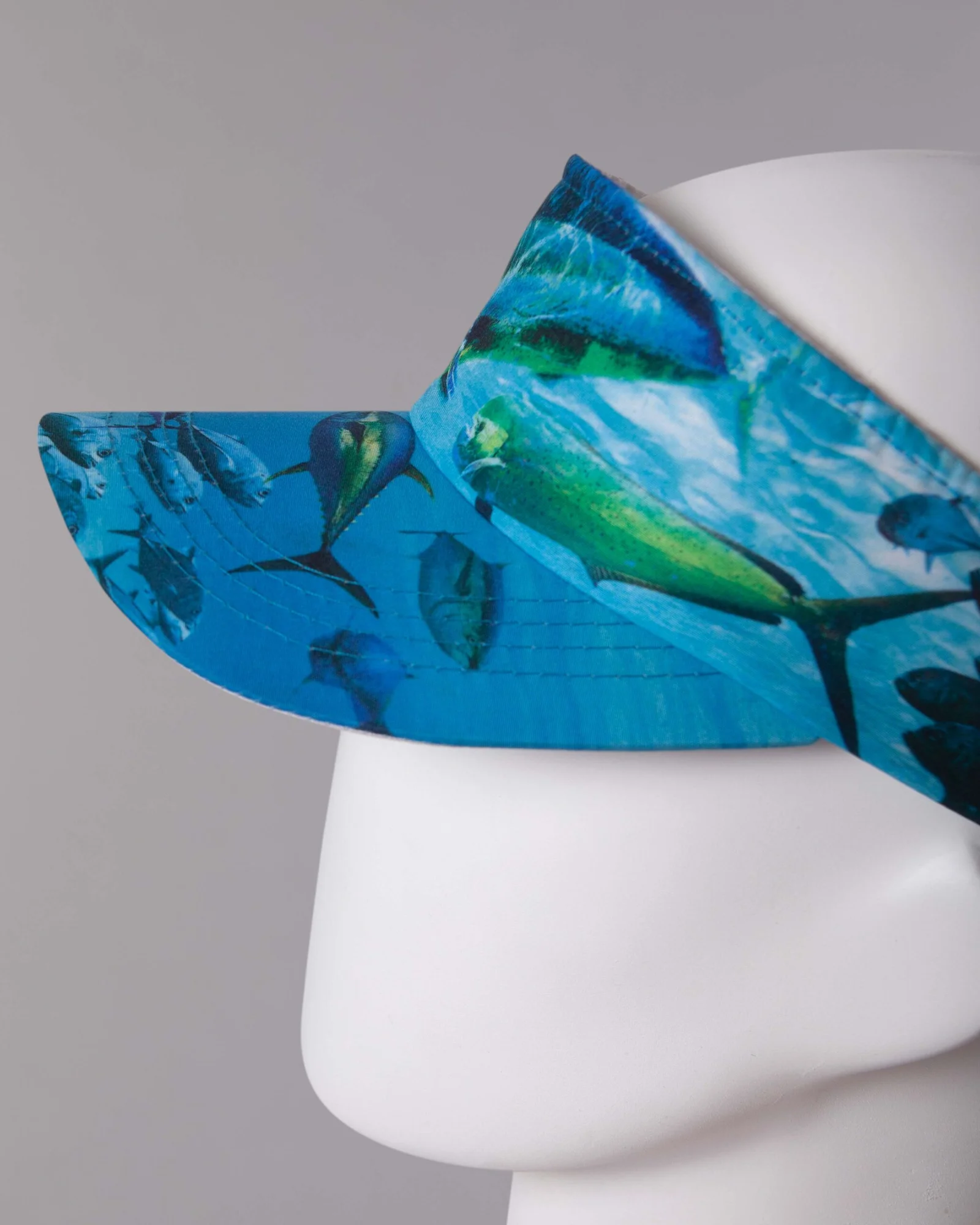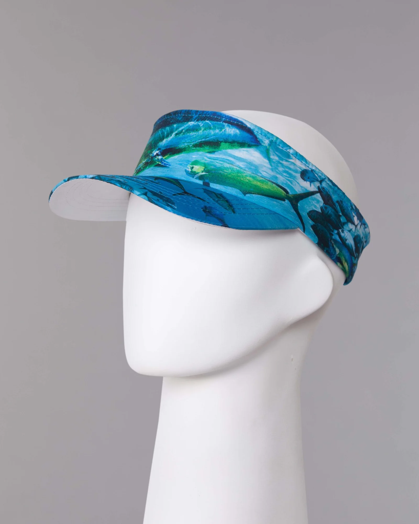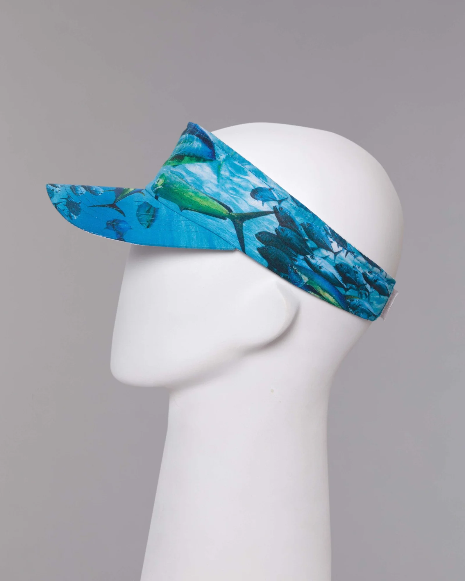 Visera en tela antifluido con sublimación digital, visera inferior en contraste blanco y ajuste regulador trasero velcro adhesivo